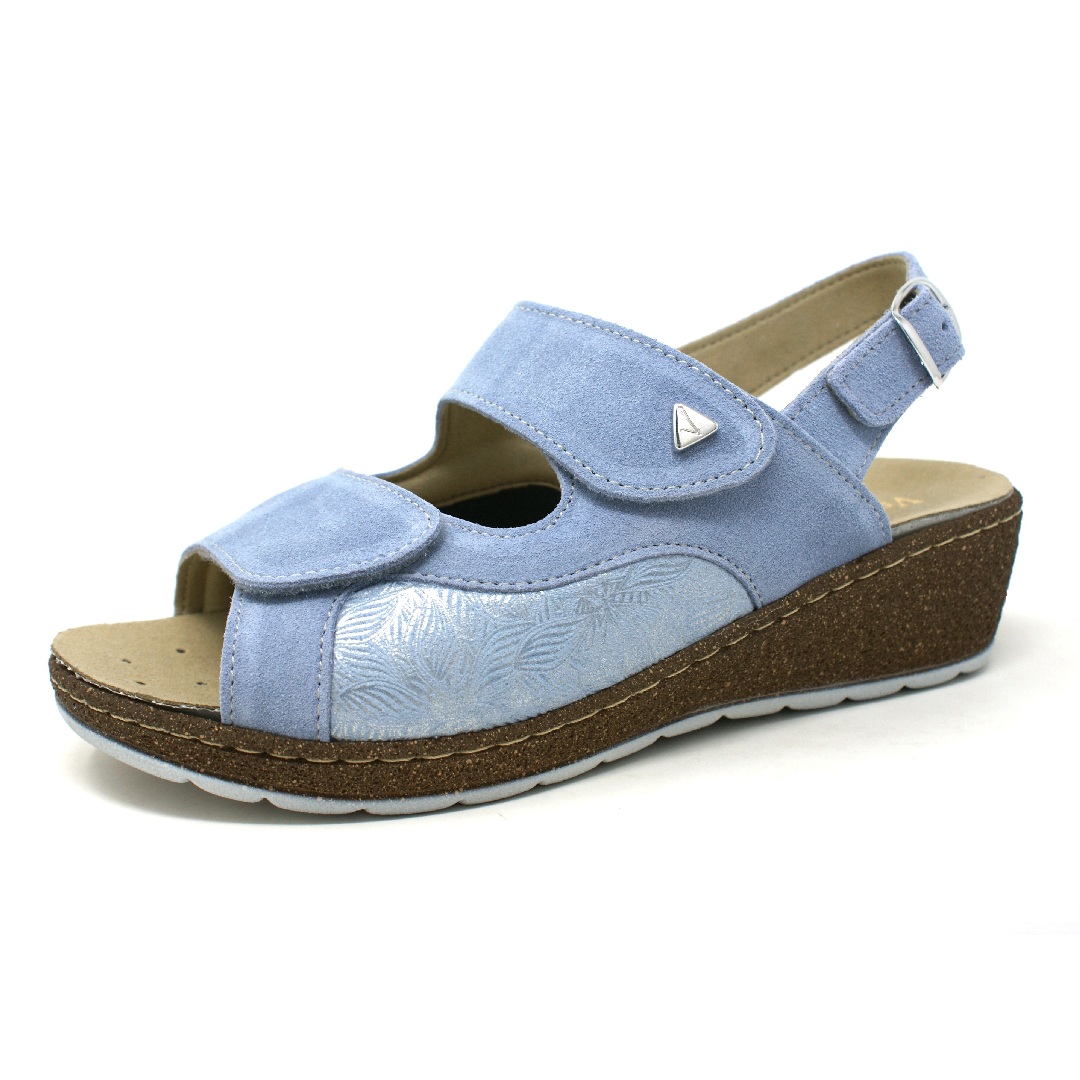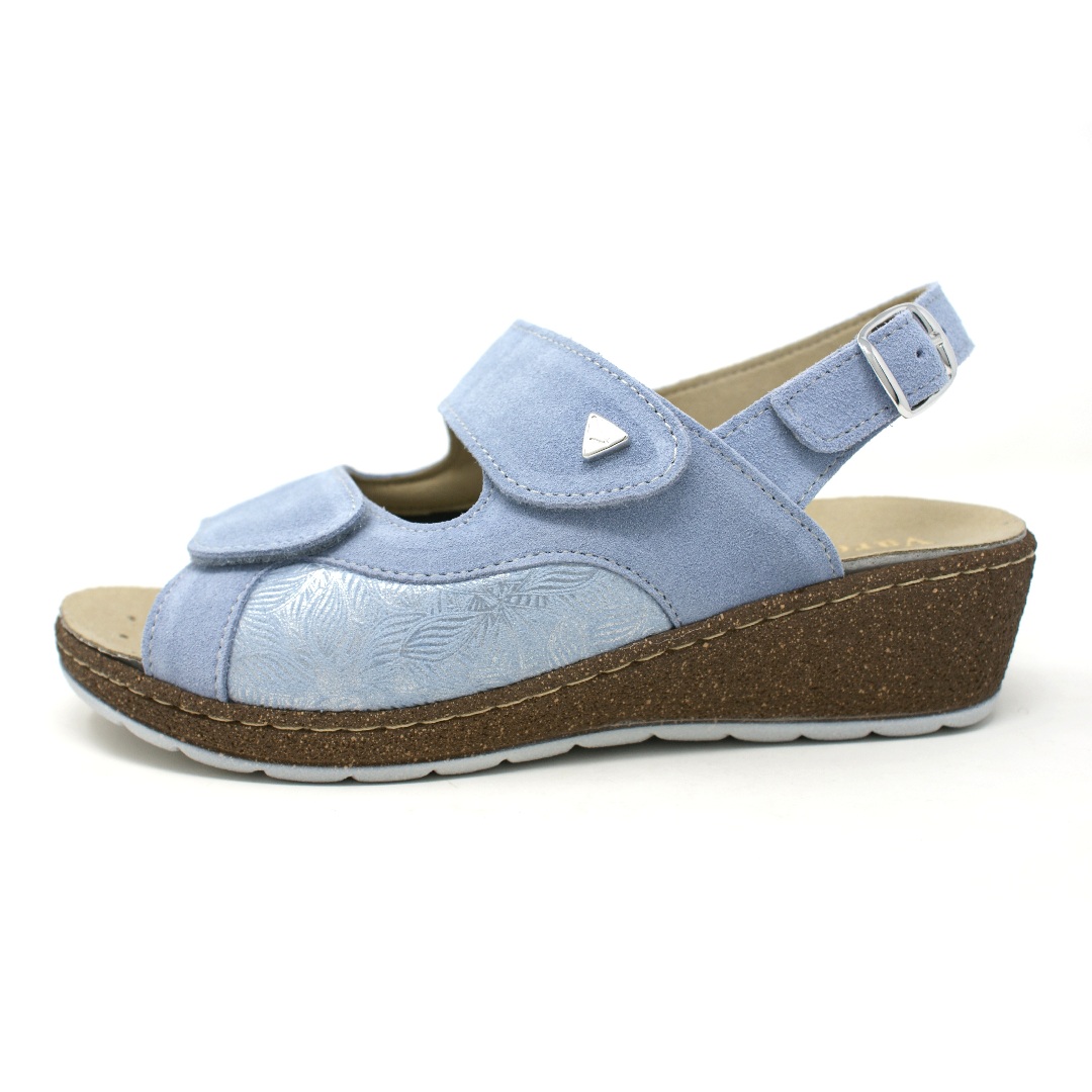 Dámské sandály Varomed 07.236/21 v jemném modrém provedení představují pohodlnou a funkční obuv vhodnou pro každodenní nošení i citlivá chodidla. Svršek je vyroben z kvalitní kombinace broušené kůže a jemně strukturovaného materiálu, který dodává modelu elegantní vzhled. Dva nastavitelné pásky na suchý zip spolu se zadním páskem s přezkou umožňují přesné přizpůsobení obuvi podle individuálních potřeb a zajišťují stabilní usazení nohy.