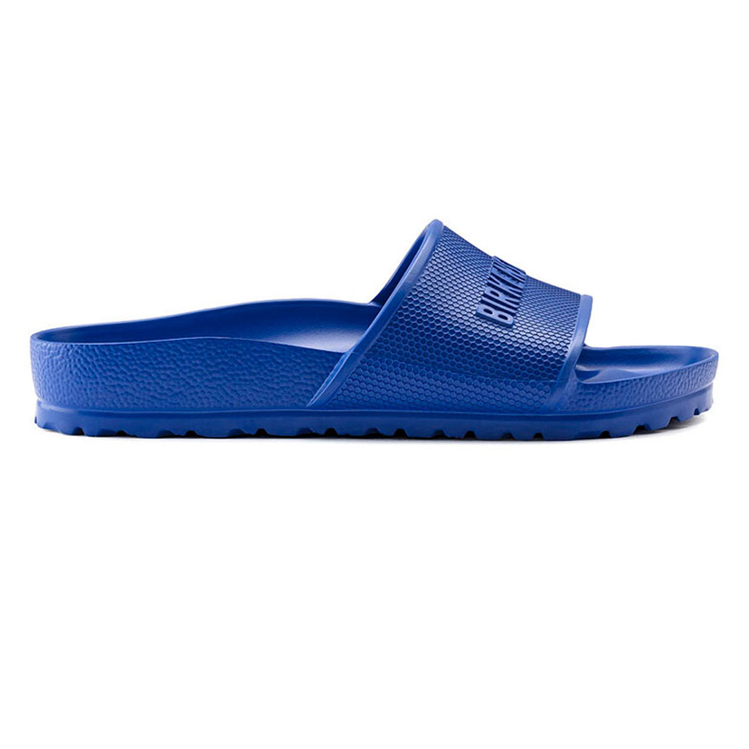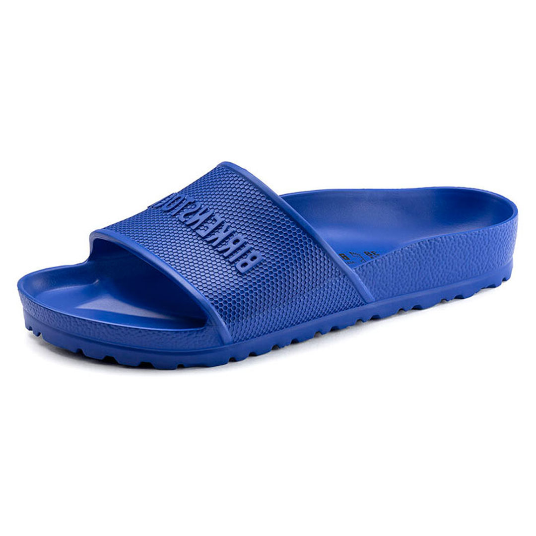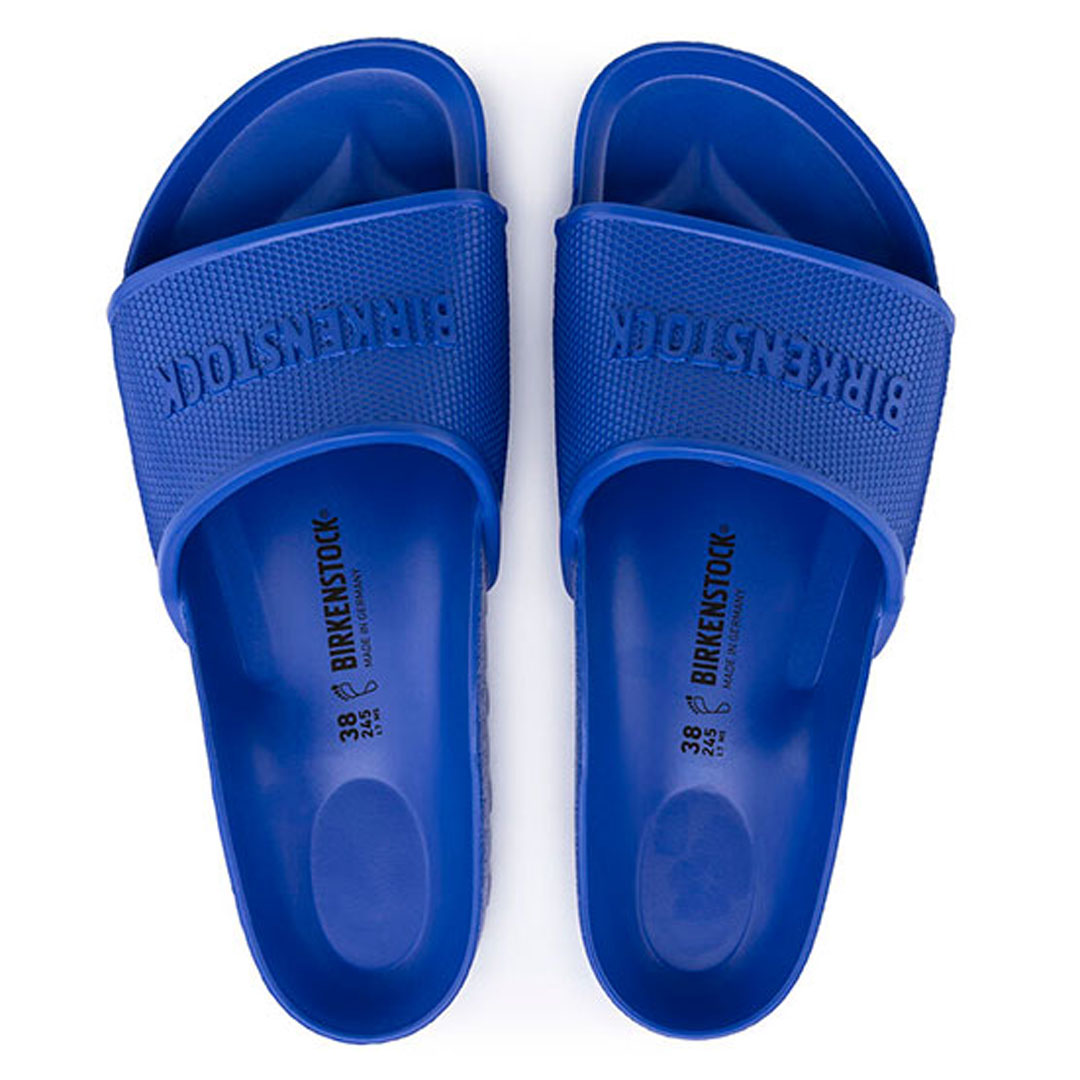Tyto lehké pantofle značky Birkenstock v sytě modrém provedení jsou ideální volbou pro volný čas, domácí nošení, k bazénu i na dovolenou. Jednodílný svršek z odolného, voděodolného materiálu EVA je velmi lehký, snadno omyvatelný a rychle schne. Široký nártový pásek s jemnou strukturou zajišťuje pohodlné obutí a stabilitu při chůzi, zároveň dodává obuvi sportovní a moderní vzhled.