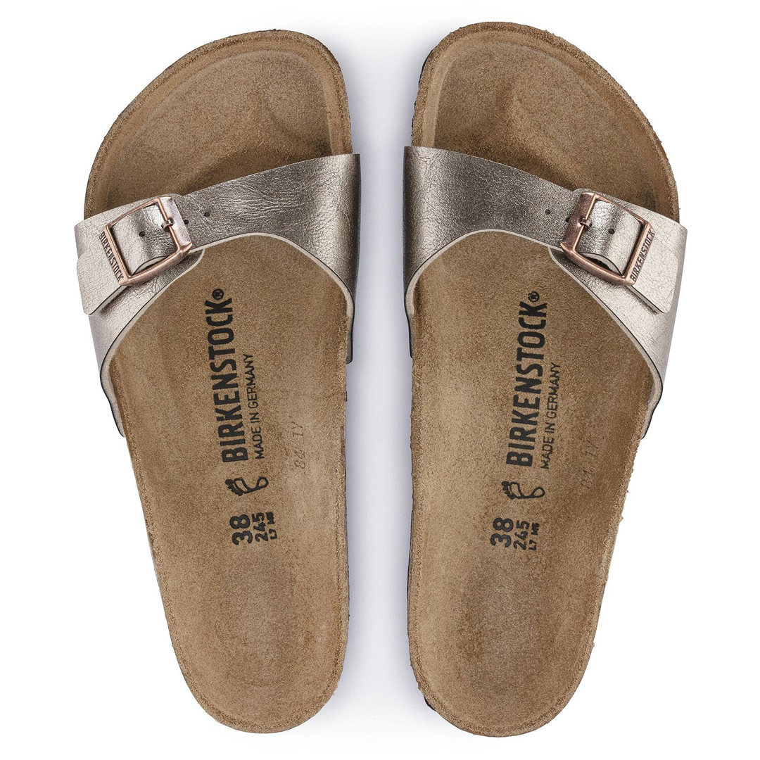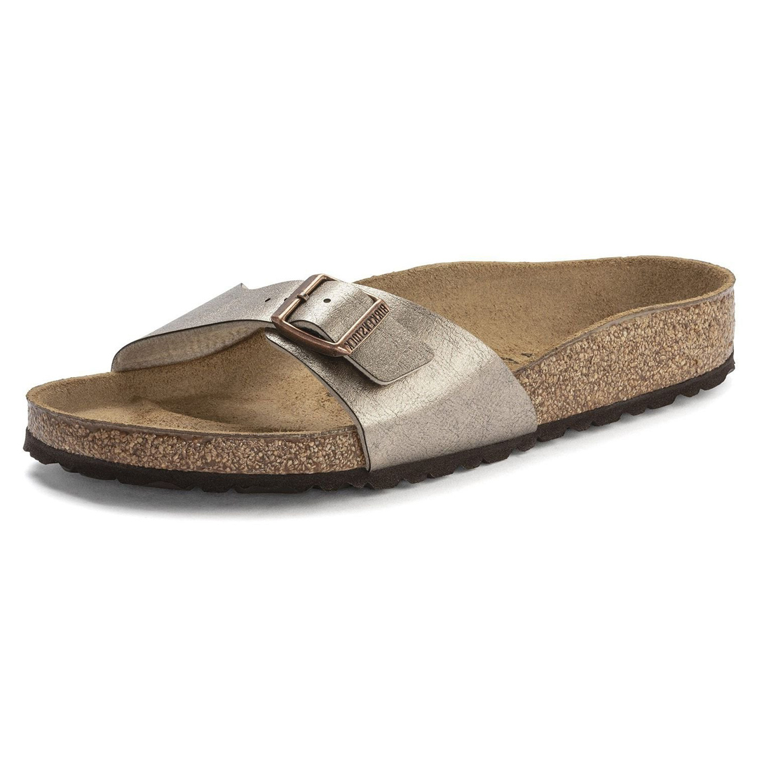 Birkenstock Madrid v provedení Birko-Flor® Graceful je elegantní jednopásková sandála, která kombinuje minimalistický design s vysokým komfortem. Svršek je vyroben z kvalitního materiálu Birko-Flor® s jemným lesklým povrchem, který je odolný a snadno se udržuje. Anatomicky tvarovaná korková stélka poskytuje vynikající podporu chodidla, zatímco lehká EVA podešev zajišťuje pohodlí při každém kroku. Tato sandála je ideální pro každodenní nošení, ať už do města, na procházky nebo na volný čas. Díky jednoduchému designu a široké škále barevných variant lze snadno kombinovat s různými outfity. Nastavitelný pásek s kovovou přezkou umožňuje individuální přizpůsobení obuvi pro optimální fit.