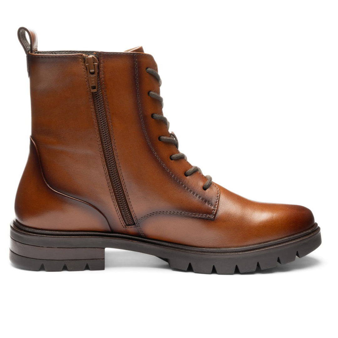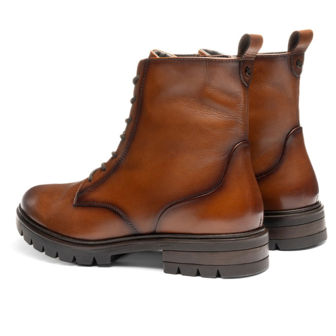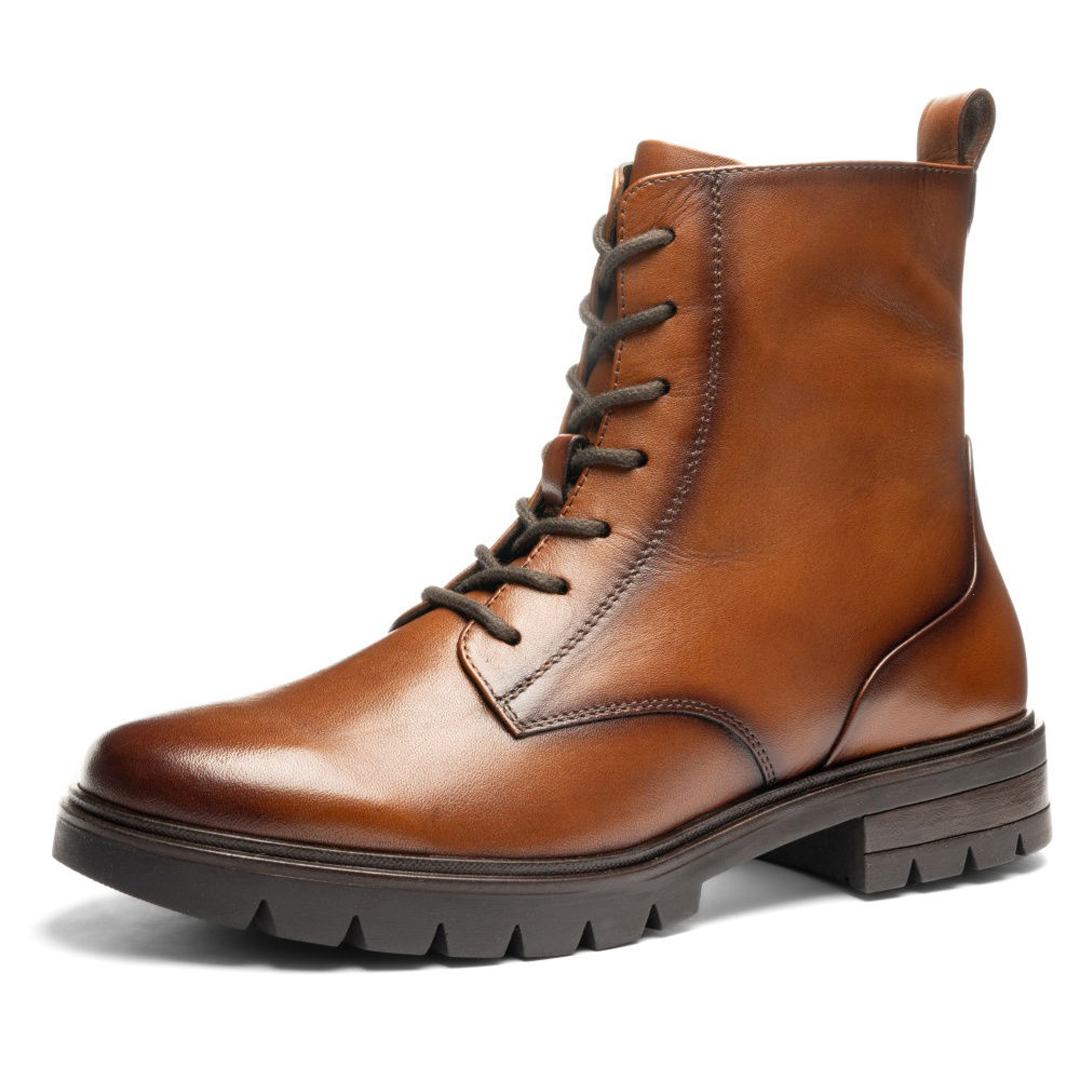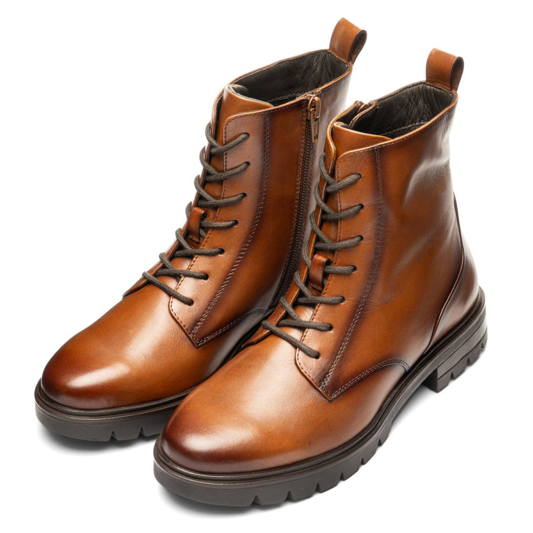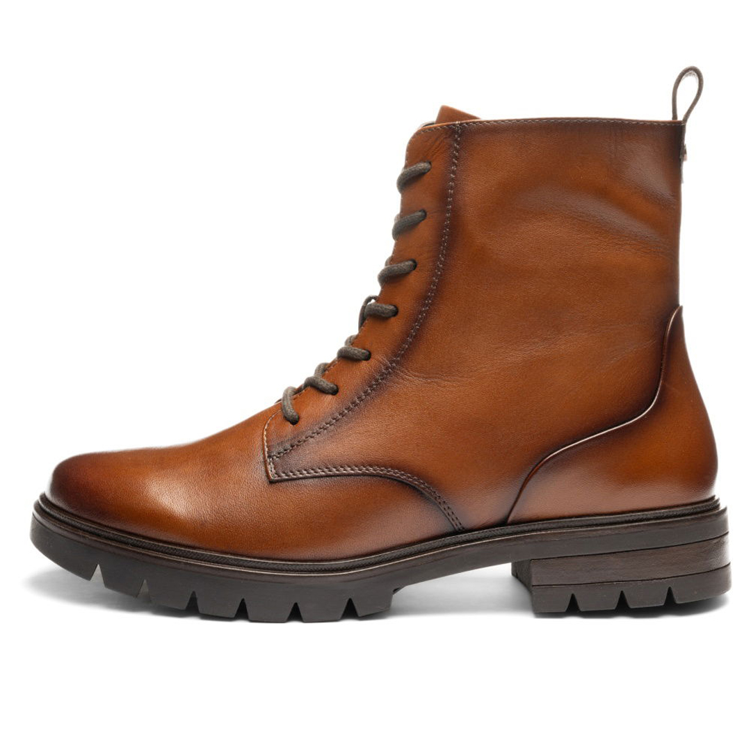 Kotníkový model Cambridge Cognac od Ara je pohodlný dámský zimní bot, který spojuje styl i funkčnost. Svršek je z hladké kůže v koňakovém odstínu, uvnitř je měkká textilní podšívka a kombinace kůže a textilu v oblasti stélky. Boty mají klasické šněrování i zip na vnitřní straně, takže je lze dobře utáhnout a zároveň snadno nazout. Stélka je vyjímatelná, což umožňuje vložení vlastní vložky, má tvarovanou podporu podélné klenby i paty. Výška nártového lemu je cca 14,5 cm. Šířka označená jako “G” nabízí standardní prostor v oblasti prstů a nártu, což zajišťuje komfort bez sevření. Podešev je z latexu se zvýšeným vzorkem, což zvyšuje přilnavost zejména v chladnějším a mokrém počasí. Podešek a podpatek poskytují stabilitu, výška podpatku je cca 2,5-3,4 cm. Obuv patří k řadě HighSoft®, je tedy navržena pro měkký došlap i pohodlí při nosení ve studených dnech.