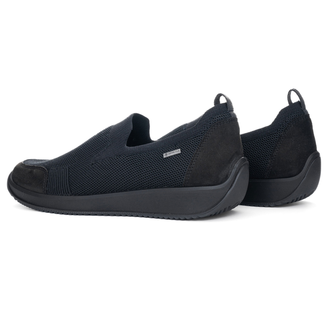Slipper od Ara je super lehká casual obuv. Vršek kombinuje pevné textilní části s broušenou kůží v oblasti paty a špičky, což dodává botě zajímavou hra-textur a zároveň stabilitu tam, kde bývá potřeba. Uvnitř je odvlhčující textilní výstelka, stélka je polstrovaná a vyměnitelná, takže můžeš použít vlastní vložku, pokud máš specifické požadavky na komfort. Boty mají elastický kraj kolem nártu a gumičkový lem, který zajistí, že bota drží nohu dostatečně pevně, ale netlačí — obouvání-sundávání je rychlé a snadné. Podešev je klínového typu s mírným zvýšením (cca 3,5 cm), což opticky prodlužuje nohu, ale zachovává pohodlí při chůzi. Šířka označená jako G znamená normální velikostní šíři, takže noha by měla mít dost prostoru zejména v přední části. Obuv patří do řady HighSoft a disponuje Gore-Tex membránou, takže je do jisté míry ochrana proti vlhkosti a větší komfort při delším nošení.