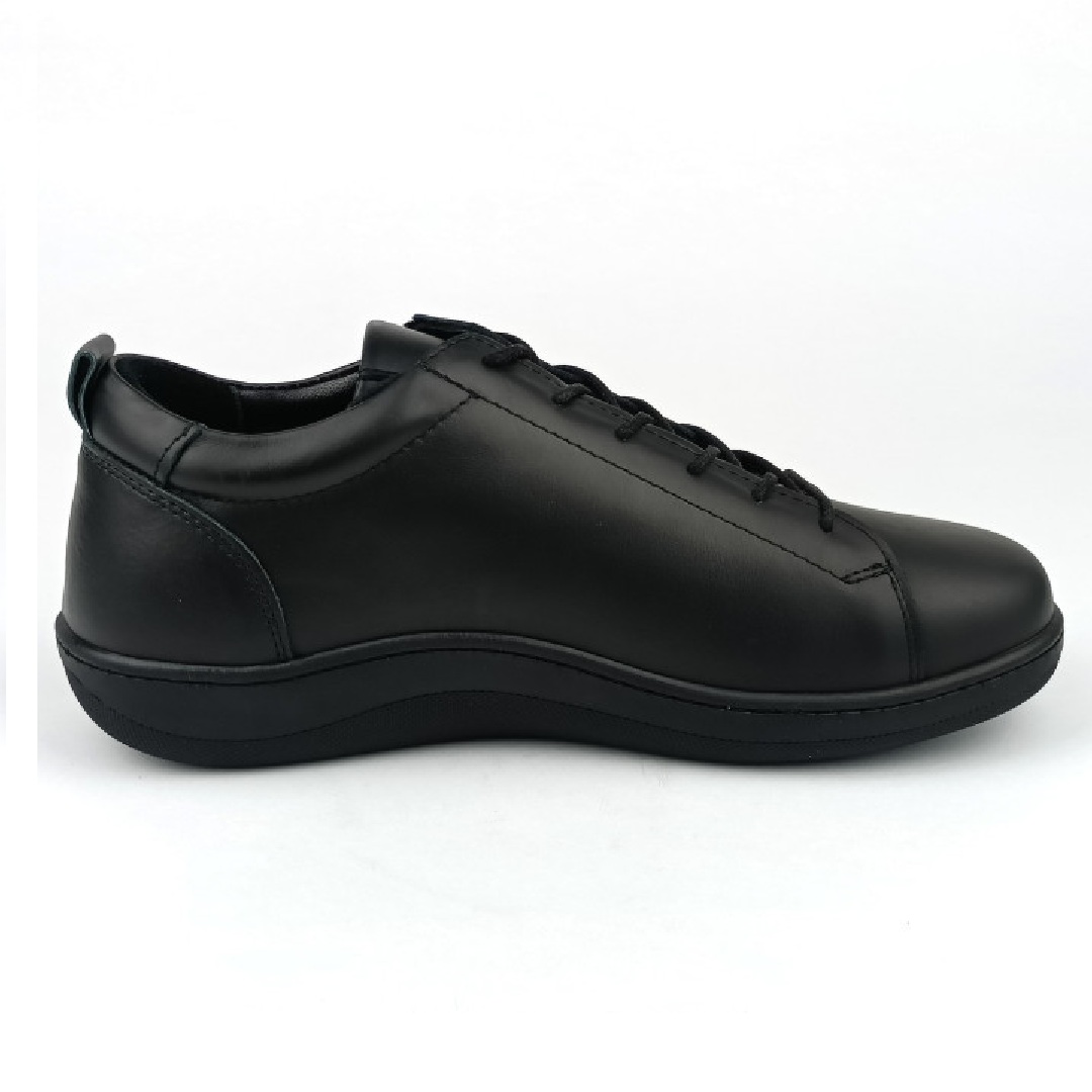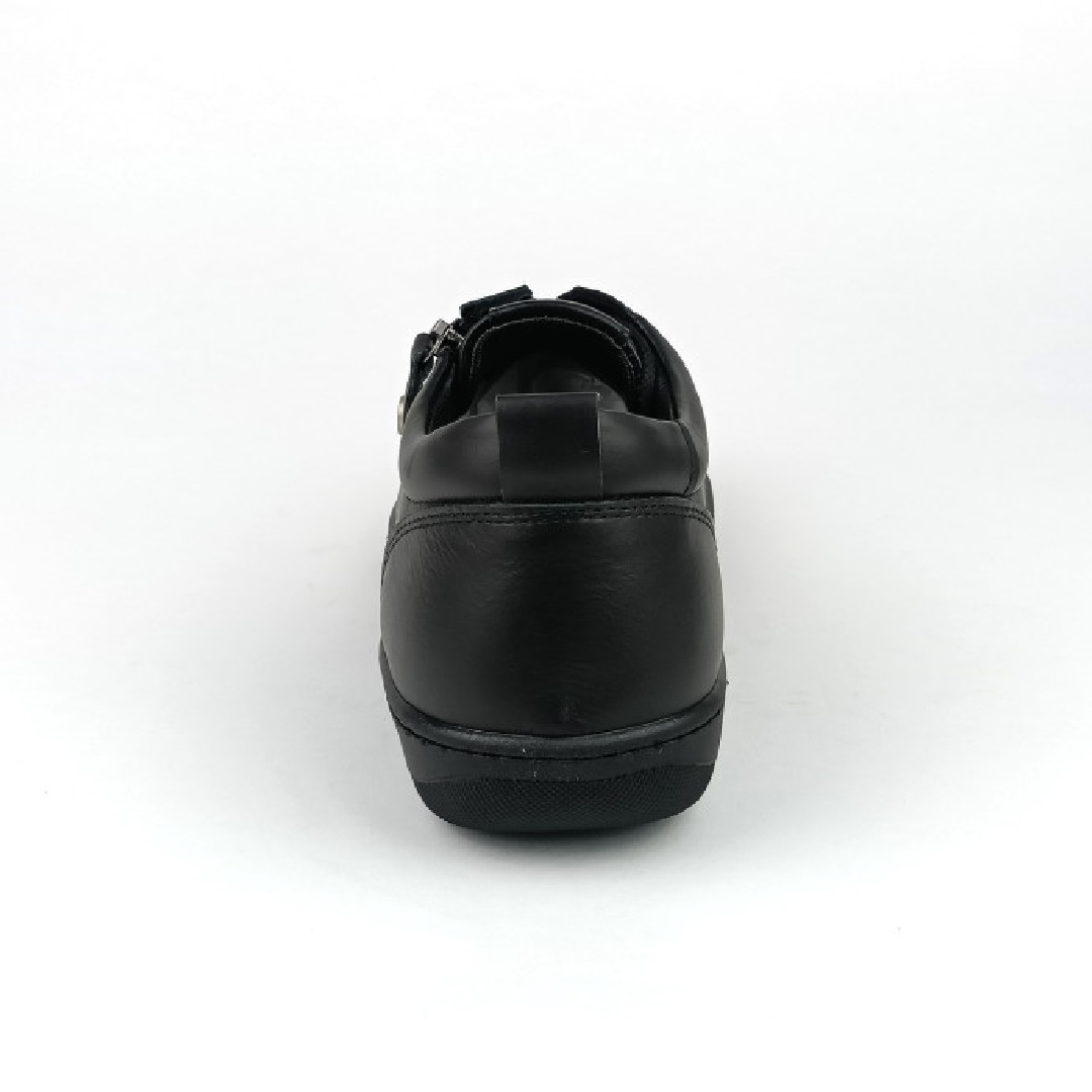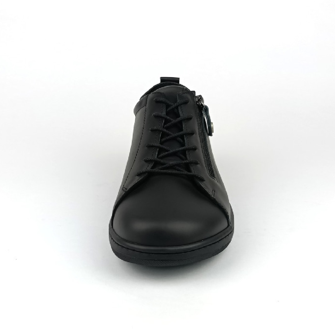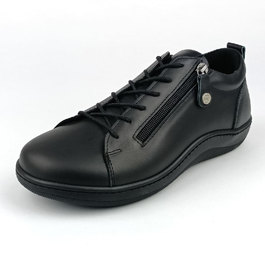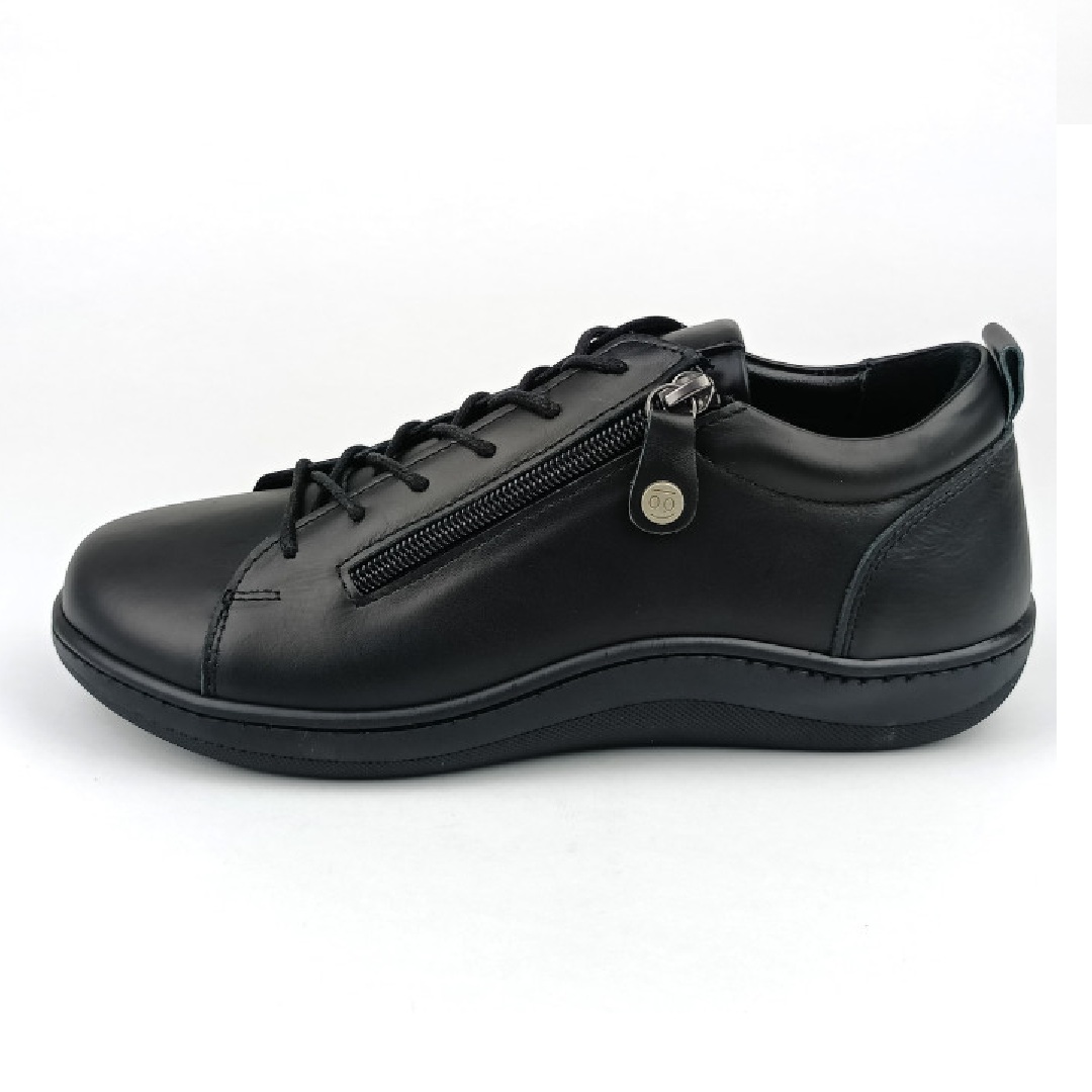 Dámské polobotky Looke v černém provedení jsou vyrobeny z hladké přírodní kůže, která zajišťuje elegantní vzhled a zároveň dobrou přizpůsobivost tvaru chodidla. Obuv není zateplená a je vhodná pro teplejší období v roce. Zapínání je řešeno kombinací klasického šněrování a bočního zipu, což usnadňuje obouvání a umožňuje přesné nastavení na nártu. Vnitřní stélka je vyjímatelná, a proto ji lze v případě potřeby nahradit individuální ortopedickou vložkou.