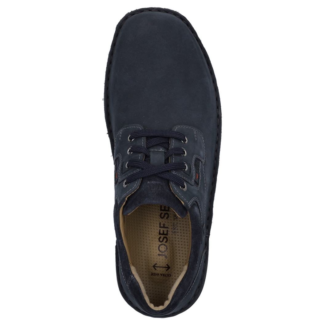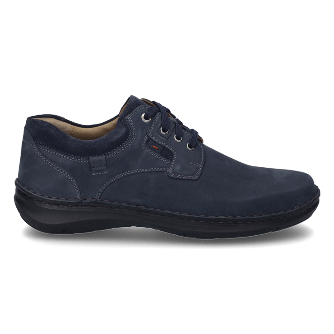 Pánské polobotky New Anvers 36 v odstínu indigo od Josef Seibel jsou vyrobené z kvalitní nubukové hovězí kůže, která působí elegantně a zároveň se snadno kombinuje s džínami i formálnějším oblečením. Mají klasické šněrování, které umožňuje přizpůsobit obuv tvaru nohy, a koženou podšívku i stélku, díky nimž boty dobře dýchají a zajišťují pohodlí při celodenním nošení. Šířka K nabízí více prostoru v oblasti nártu a prstů, což ocení muži se širším chodidlem nebo ti, kdo preferují volnější střih. Podešev z lehkého a pružného PU materiálu zajišťuje stabilitu a měkký došlap, podpatek má výšku přibližně 2 cm, takže poskytuje nenápadný, příjemný zdvih. Ručně šité detaily podtrhují kvalitní zpracování a dlouhou životnost této obuvi.