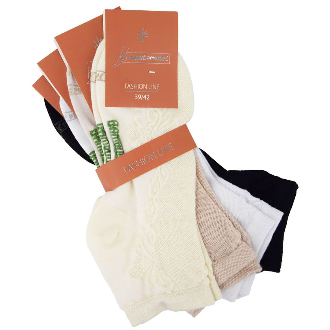 Dámské kotníkové ponožky Zdravé ponožky v balení mix představují elegantní a pohodlný model vhodný pro každodenní nošení zejména v teplejších dnech. Jsou vyrobeny z kvalitní směsi s vysokým podílem viskózy (80 %) z bambusové celulózy, doplněné o polyamid (17 %) a elastan (3 %), což zajišťuje jemnost, prodyšnost a příjemný komfort při nošení. Materiál je hebký na dotek, dobře odvádí vlhkost a díky pružnosti se ponožky optimálně přizpůsobují chodidlu bez nepříjemného tlaku. Jemný krajkový vzor dodává modelu ženský a stylový vzhled. Pohodlí při nošení podporuje plochý řetízkovaný šev v oblasti špice, který minimalizuje vznik otlaků a zvyšuje komfort během chůze. Zesílená pata a špice napomáhají vyšší odolnosti a delší životnosti při pravidelném používání. Jemný pružný lem dobře drží na noze, aniž by nepříjemně svíral. Praktické balení mix barev nabízí univerzální využití pro běžné denní nošení i volnočasové aktivity.