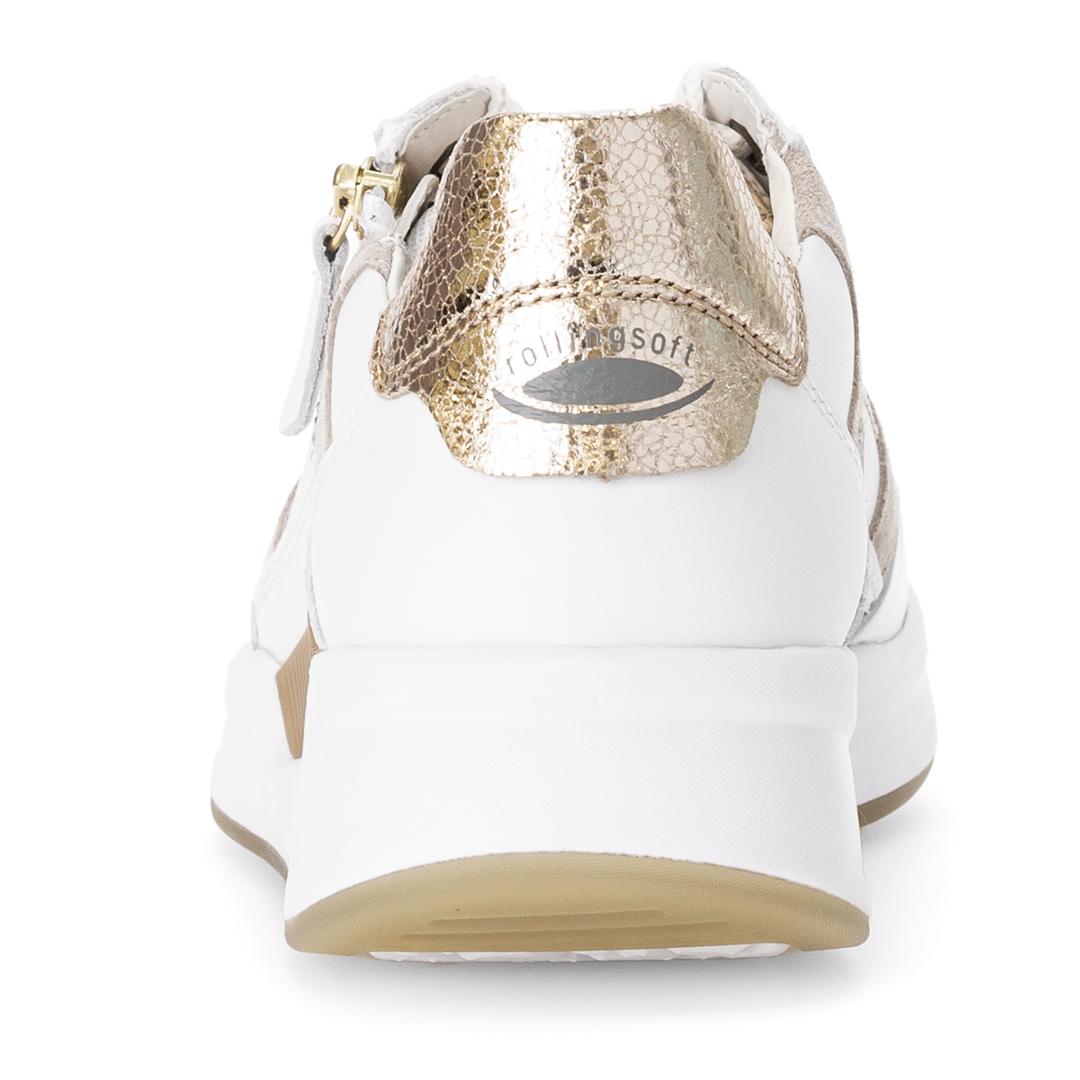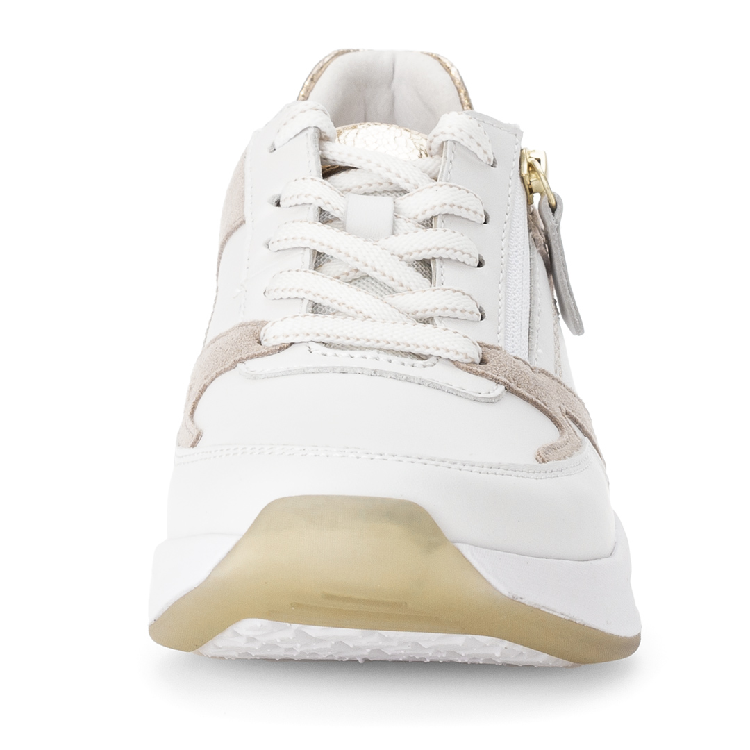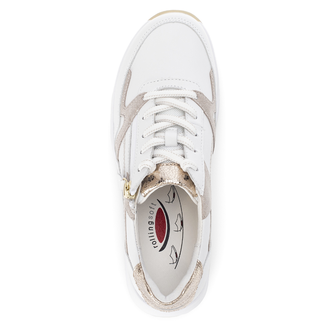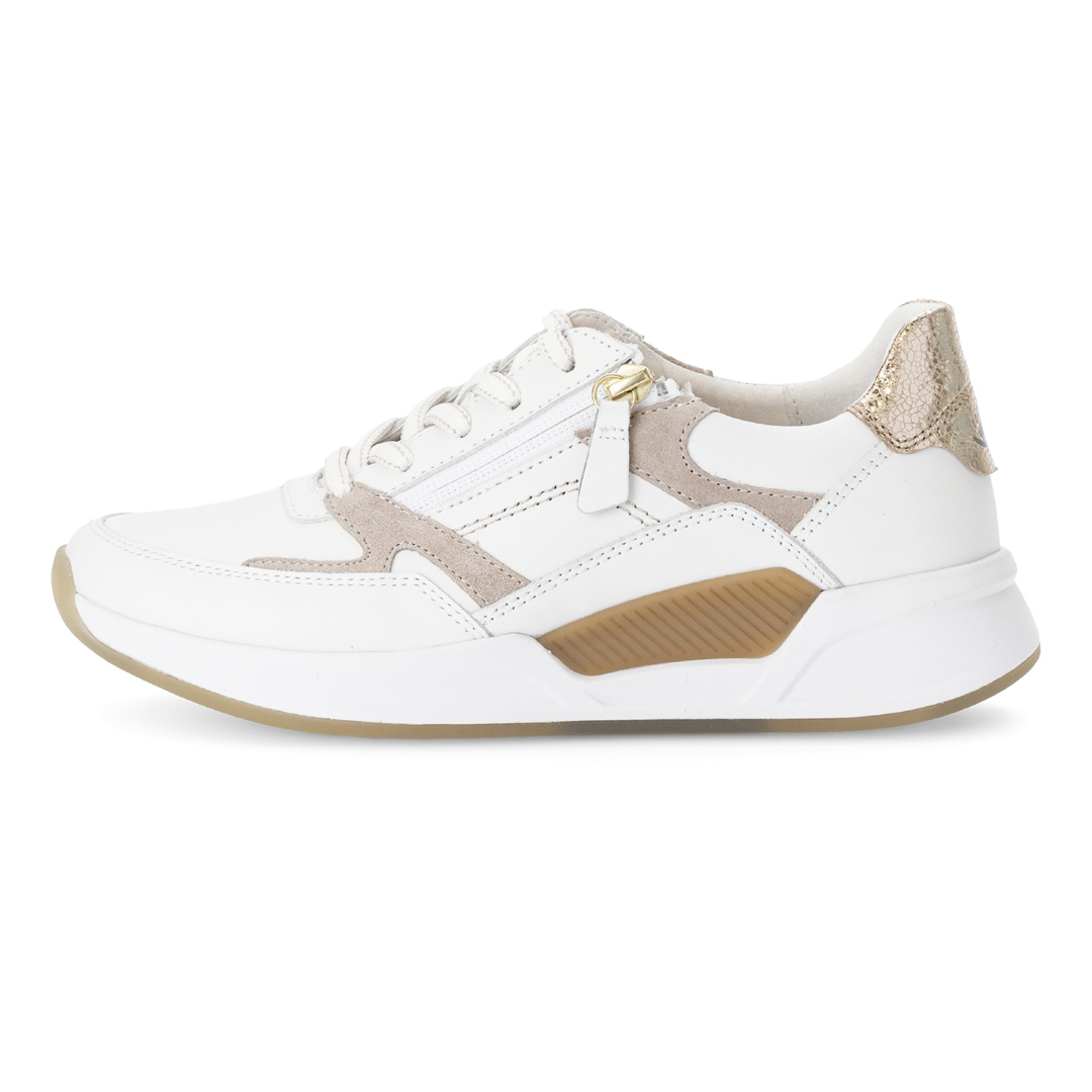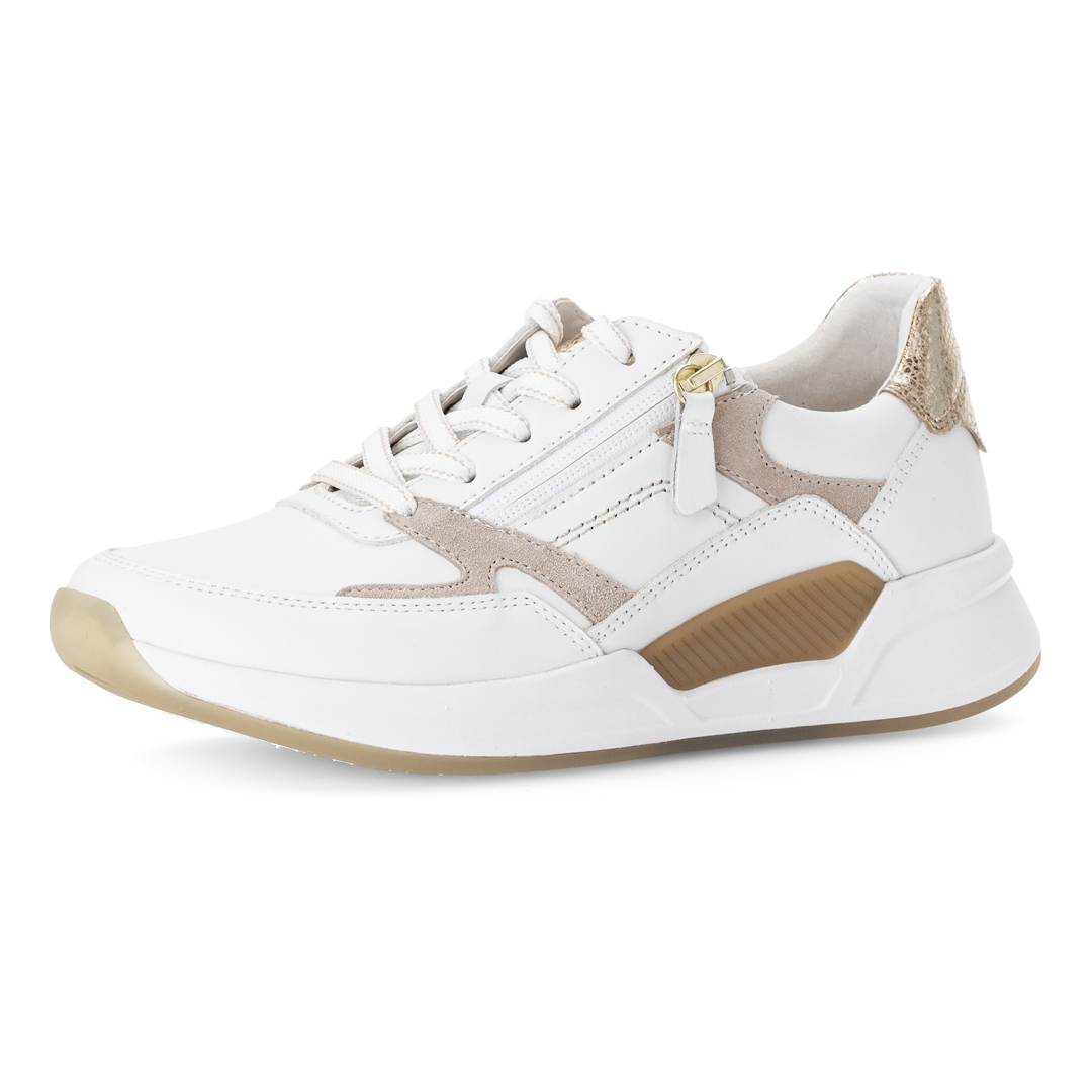 Dámské nízké tenisky Gabor v bílé barvě jsou vyrobeny z kombinace kvalitní usně a syntetických materiálů, což zajišťuje odolnost a pohodlí. Design s kulatou špičkou a čistými liniemi dodává obuvi moderní a nadčasový vzhled, zatímco bílá barva umožňuje snadné kombinování s různými outfity. Obuv je vybavena vyjímatelnou stélkou, která umožňuje použití vlastních ortopedických vložek pro individuální pohodlí. Nízký podpatek a flexibilní podešev zajišťují stabilitu a komfort při chůzi. Díky pečlivému zpracování a použití kvalitních materiálů jsou tyto tenisky ideální volbou pro ženy hledající kombinaci stylu a pohodlí v každodenním nošení.