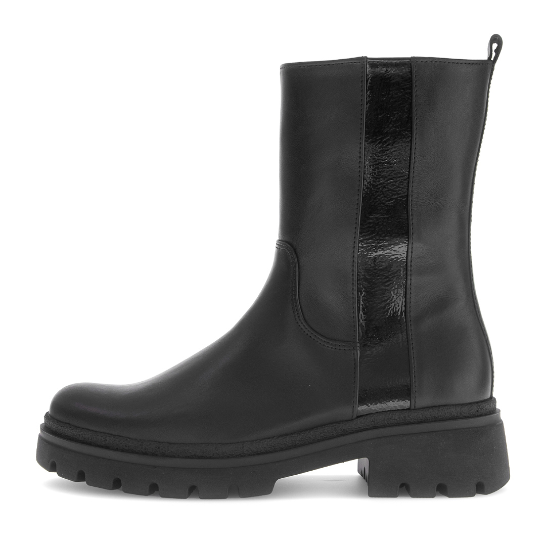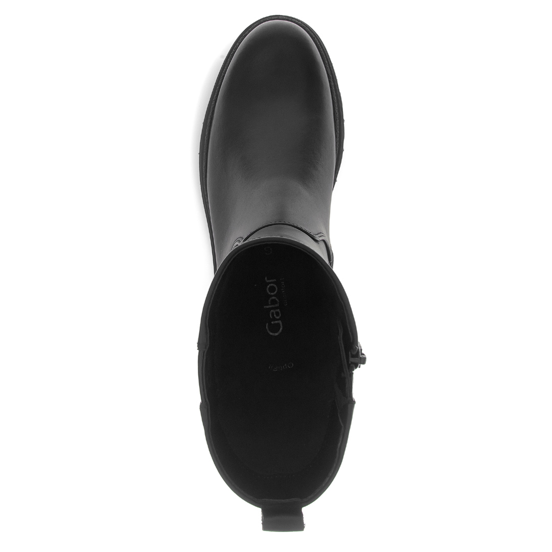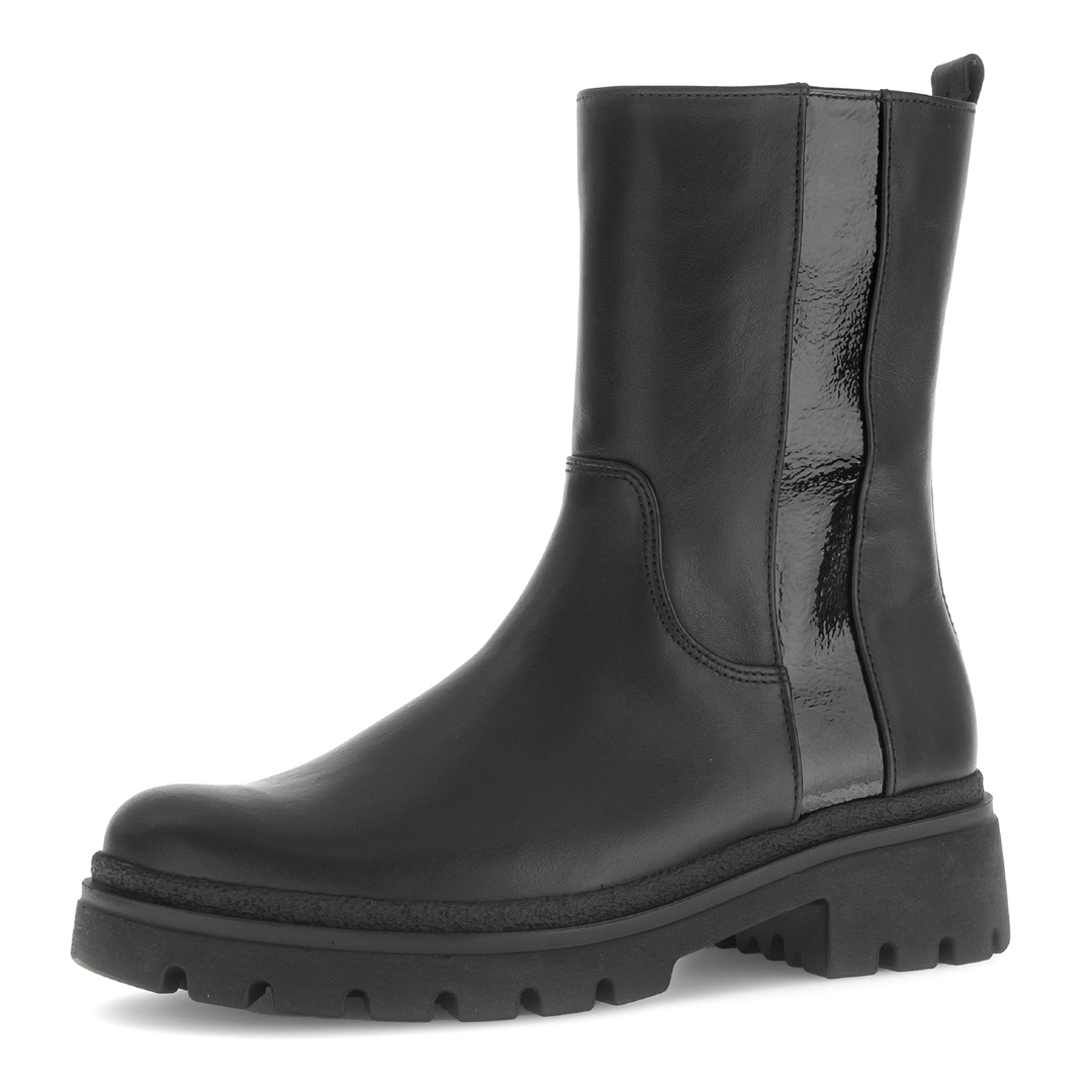 Stylové dámské kotníkové boty Gabor v elegantní černé barvě spojují moderní design s maximálním komfortem. Vyrobené z kvalitní hladké usně doplněné lesklým prvkem na patní části působí sofistikovaně a zároveň nadčasově. Robustní profilovaná podešev zajišťuje stabilitu a pohodlí i při delším nošení, zatímco měkká stélka se přizpůsobí chodidlu. Díky pružným vsadkám se boty snadno nazouvají a perfektně sedí. Tyto boty jsou ideální volbou pro podzimní i zimní období – skvěle doplní jak ležérní džíny, tak elegantní kabát.