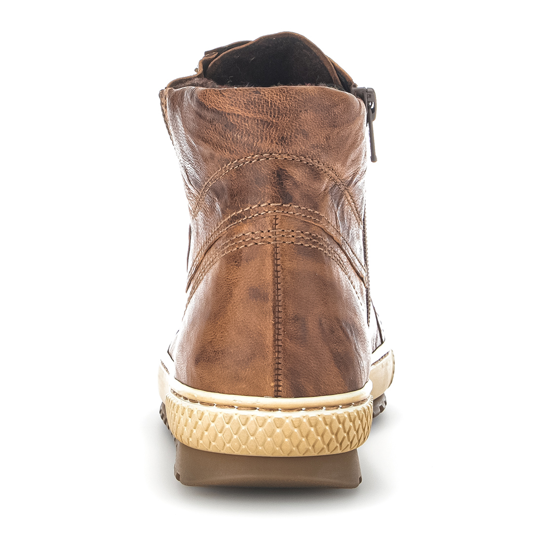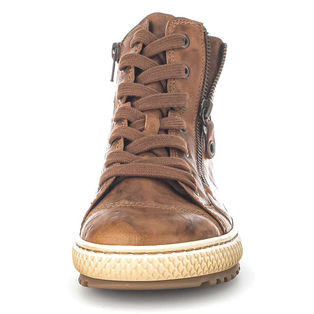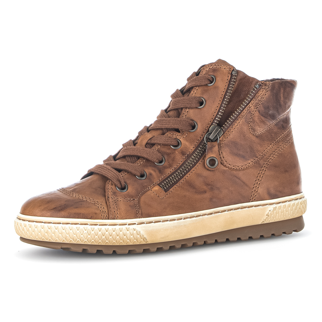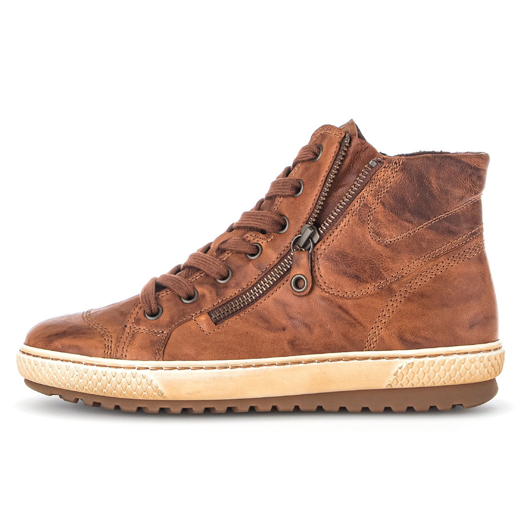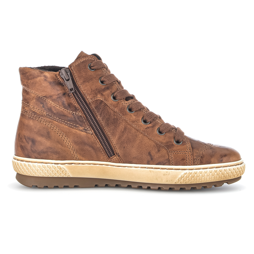 Tento hnědý „sneaker high“ od Gaboru spojuje sportovní styl s komfortem i kvalitními materiály. Vrchní část je z hladké kůže, která působí čistě a elegantně, zároveň je snadná na údržbu. Obuv má boční zip, takže se do ní jednoduše nazouvá, a kulatou špičku, která podrží nohu bez nepříjemného sevření. Výška svršku pod kotník je cca 12 cm – poskytuje mírnou podporu achilovy paty i kotníku, aniž by překážela ve volnosti pohybu. Podrážka je měkce polstrovaná a bota je vybavena vyjímatelnou stélkou (vhodnou pro vložky), což podpírá hygienu a individuální pohodlí. Patka je nízká (cca 2,5 cm), takže bota je spíš nízko naddimenzovaná než vystoupající – vhodná pro dlouhé dny plné chůze. Šířka označená jako „F“ znamená standardní prostor pro chodidlo, což je dostačující pro průměrné nohy – nebude těsná, ale zároveň neuvolněná.