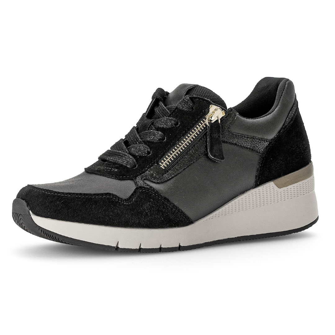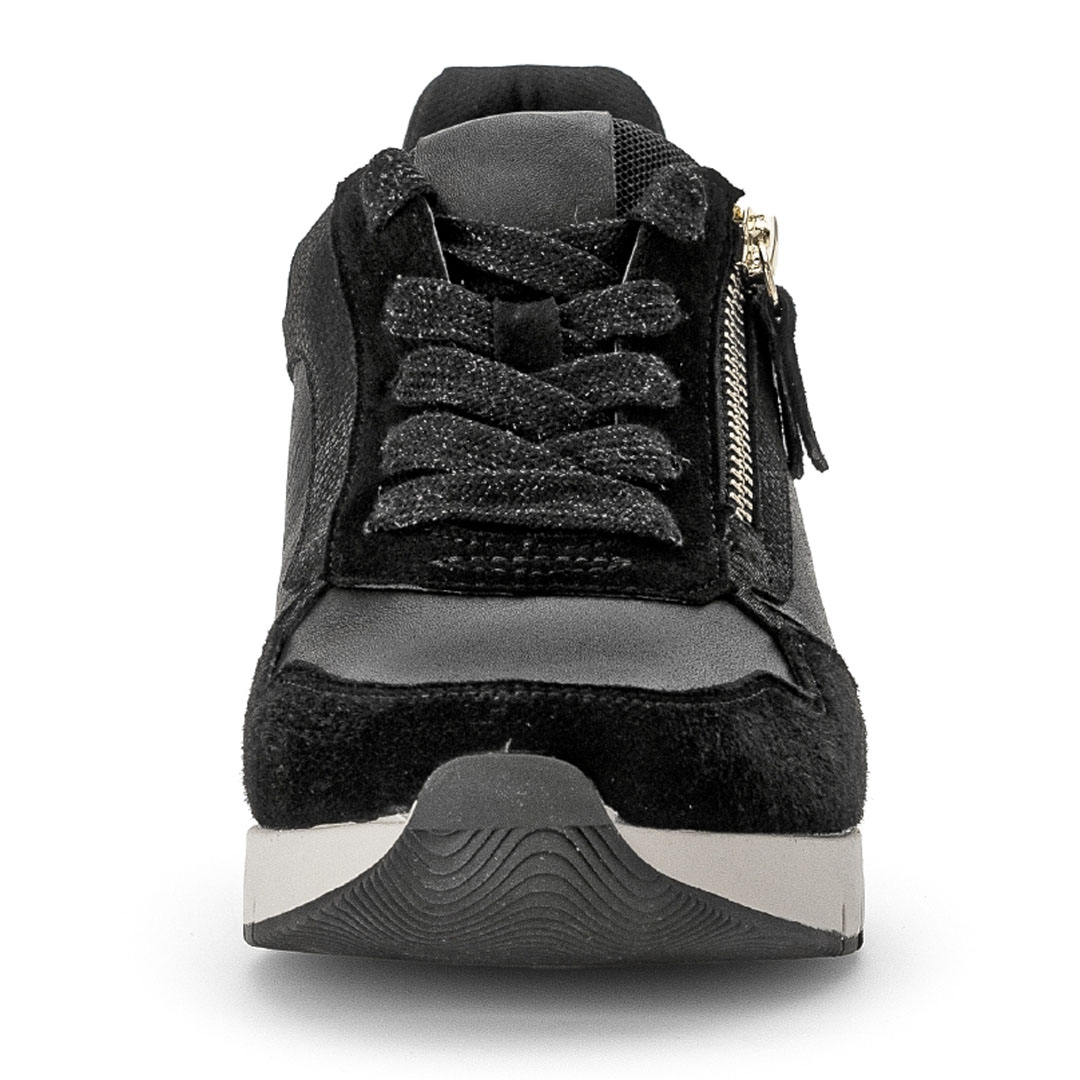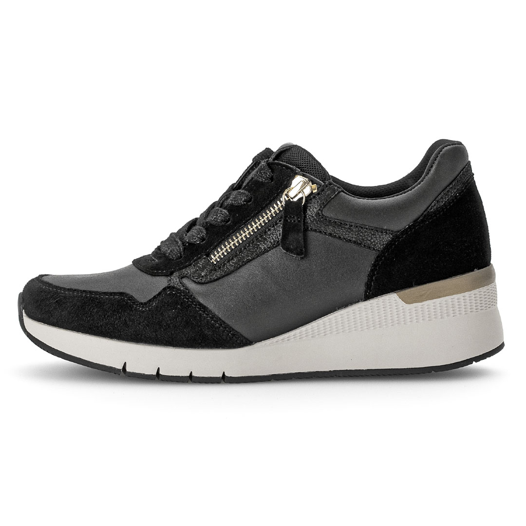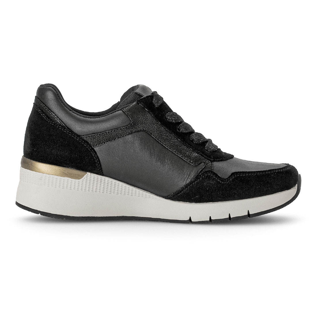 Tenisky kombinují kůži s dalšími materiály, což vytváří zajímavou texturu a odlehčený vzhled, přičemž dominuje černá barva. Design je sportovně-elegantní a střih je nízký, se zaoblenou špičkou, což zajišťuje pohodlí při každodenním nošení. Vnitřek je z kůže, takže noha lépe dýchá a je příjemnější pro delší dobu nošení. Velkým plusem je širší střih označený jako „Weite G“, který poskytuje více prostoru v oblasti nártu a prstů — ideální, pokud potřebujete uvolněnější obuv. Podešev má klínový tvar o výšce přibližně 5 cm, což přidává mírné zvýšení, aniž by se obuv stala nepohodlnou. Tenisky navíc mají vyjímatelnou stélku s podílem recyklovaných materiálů — lze ji vyměnit nebo vložit vlastní vložku.