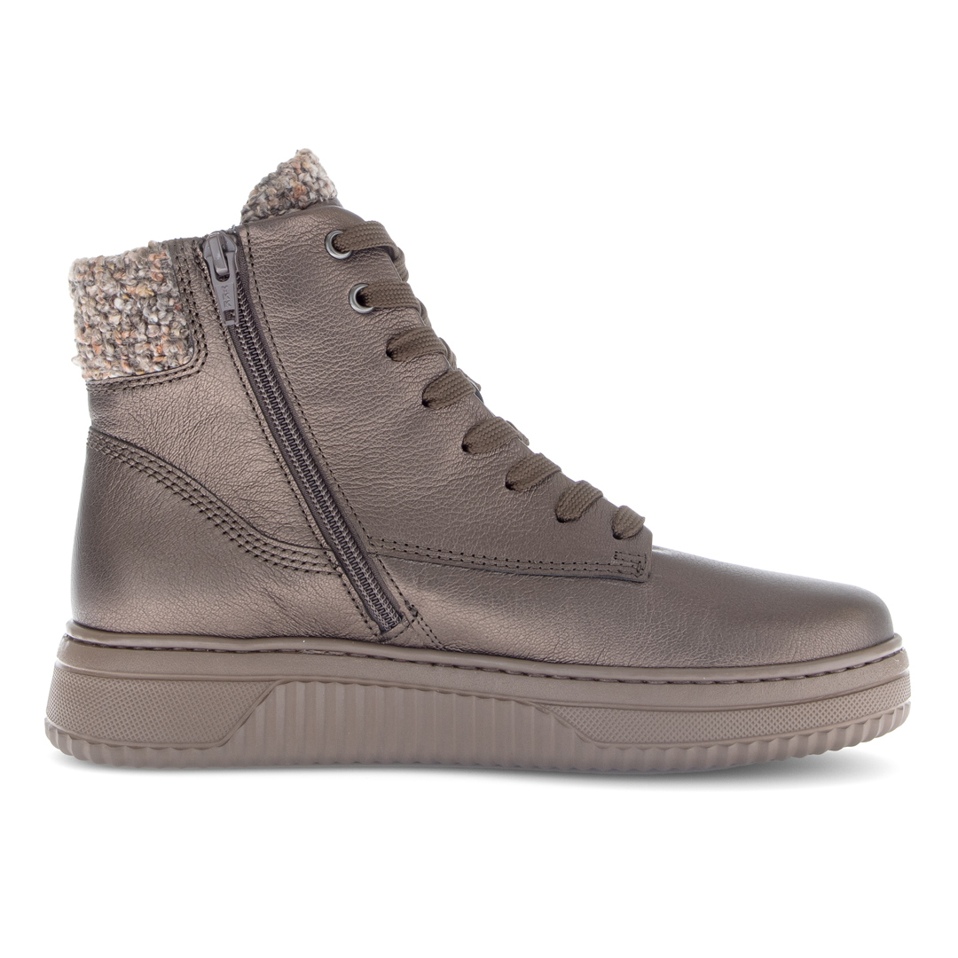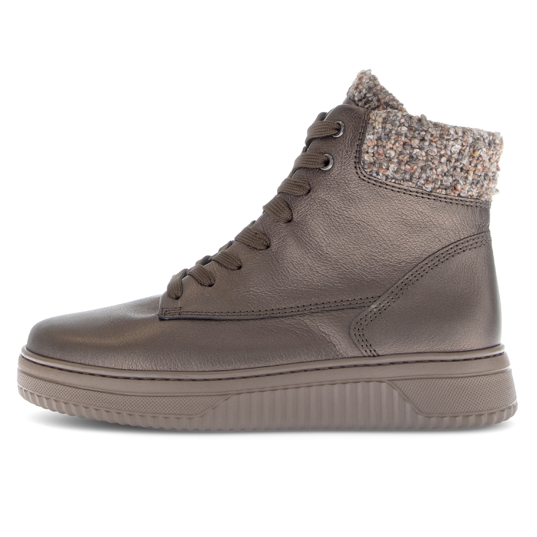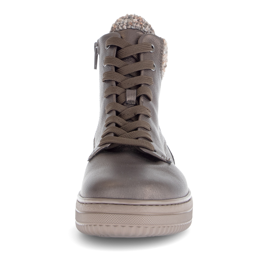 Elegantní dámské kotníkové boty Gabor v hnědo-šedém odstínu představují ideální volbu pro chladnější dny. Vyrobené z vysoce kvalitní hladké usně, nabízejí maximální komfort a dlouhou životnost. Měkký textilní lem kolem kotníku nejen krásně vypadá, ale také zajišťuje příjemné nošení bez otlaků. Praktické šněrování umožňuje dokonalé přizpůsobení noze. Pohodlná vyjímatelná stélka zajišťuje komfort i při celodenním nošení. Lehká flexibilní podešev s jemným vzorkem poskytuje jistý krok a stabilitu. Stylový design a důraz na detail dělají z těchto bot perfektní doplněk pro každodenní nošení – ke kalhotám, džínům i sportovně-elegantním outfitům.