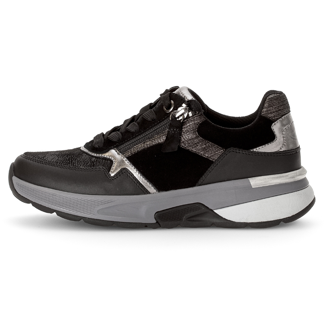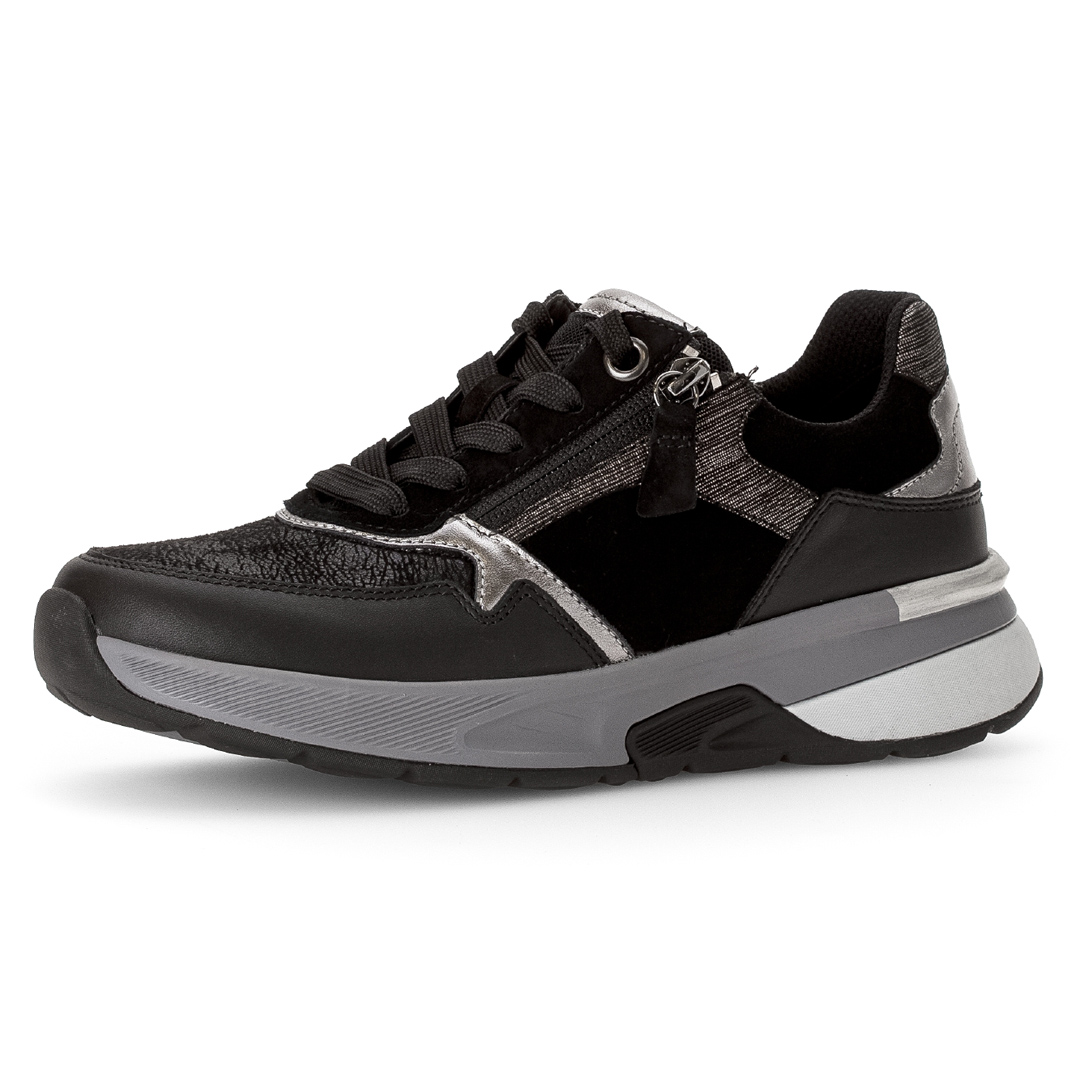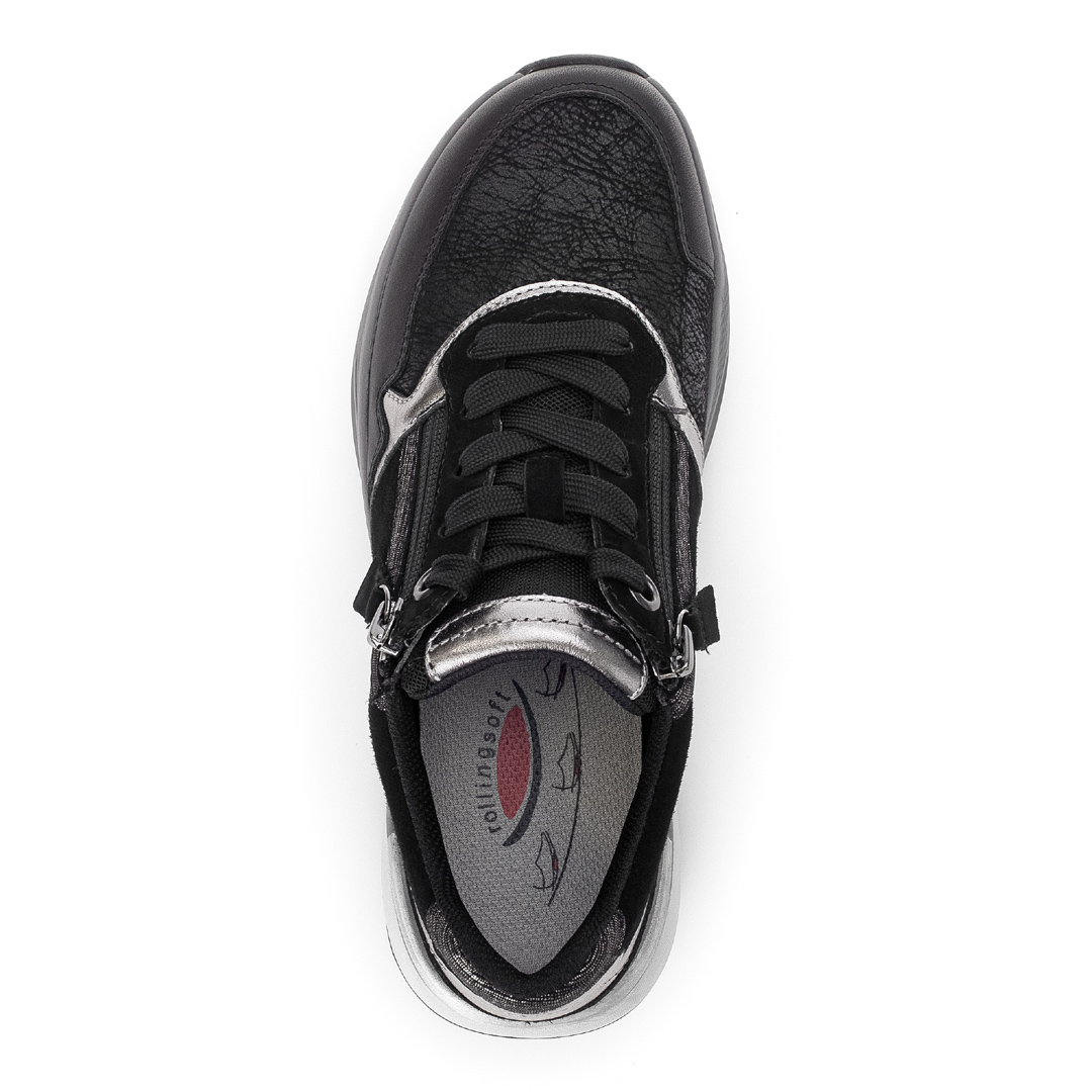 Tyto tenisky kombinují pravou kůži se syntetickými materiály („imitace kůže“) v černém provedení, což přináší mix textur a zajímavý vzhled – hladké části kontrastují s jemně strukturovanými fóliovými plochami. Střih je nízký, se zaoblenou špičkou, podšívka textilní, takže obuv uvnitř lépe dýchá. Celkový design je decentní, bez velkých ozdob – hodí se ke sportovnějším i běžným volnočasovým outfitům. Mezi výhody patří podrážka označená jako „rollingsoft“, která umožňuje pohodlné odvalování kroku díky měkkému tlumení a vyšší flexibilitě. Výška podešve (podpatku) je cca 4,5 cm, což přidává mírný zdvih bez ztráty stability. Obuv je vybavena vyjímatelnou stélkou, která obsahuje recyklované materiály – toto řešení umožňuje výměnu vložky či úpravu prostoru uvnitř boty.