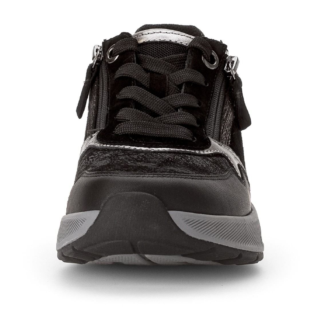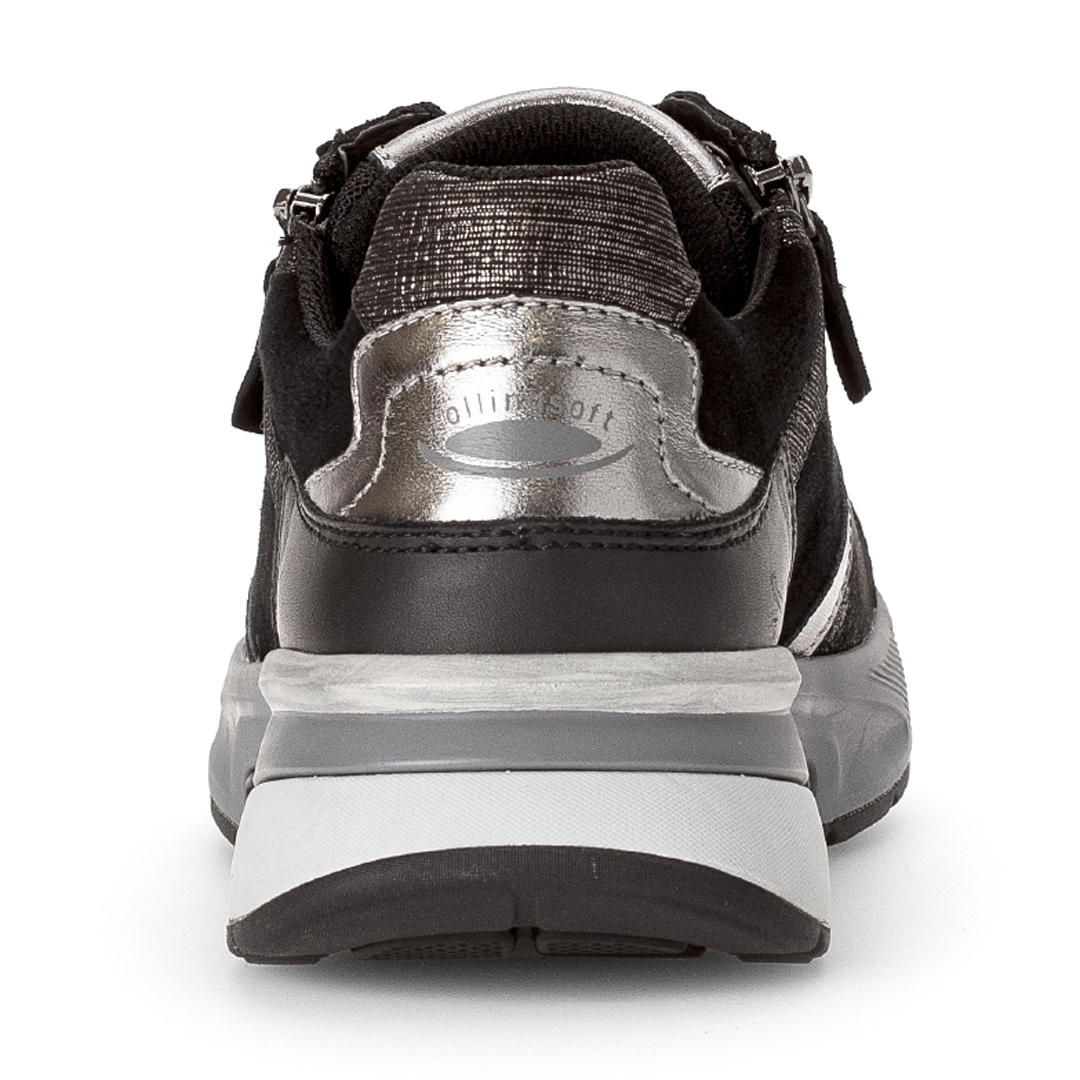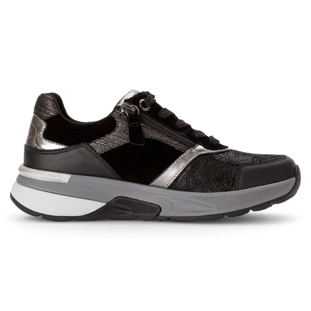 Tyto tenisky kombinují pravou kůži se syntetickými materiály („imitace kůže“) v černém provedení, což přináší mix textur a zajímavý vzhled – hladké části kontrastují s jemně strukturovanými fóliovými plochami. Střih je nízký, se zaoblenou špičkou, podšívka textilní, takže obuv uvnitř lépe dýchá. Celkový design je decentní, bez velkých ozdob – hodí se ke sportovnějším i běžným volnočasovým outfitům. Mezi výhody patří podrážka označená jako „rollingsoft“, která umožňuje pohodlné odvalování kroku díky měkkému tlumení a vyšší flexibilitě. Výška podešve (podpatku) je cca 4,5 cm, což přidává mírný zdvih bez ztráty stability. Obuv je vybavena vyjímatelnou stélkou, která obsahuje recyklované materiály – toto řešení umožňuje výměnu vložky či úpravu prostoru uvnitř boty.
