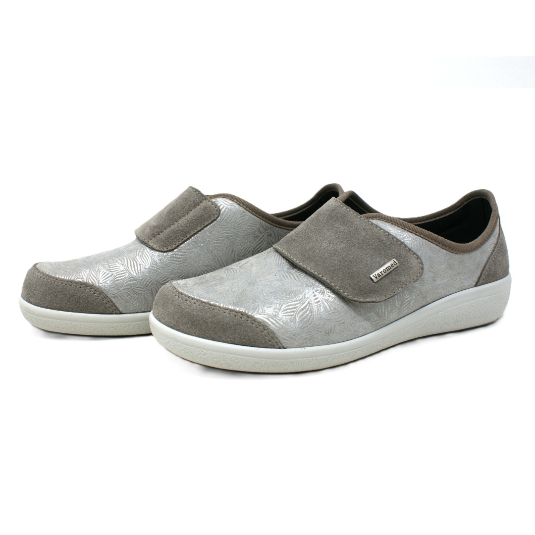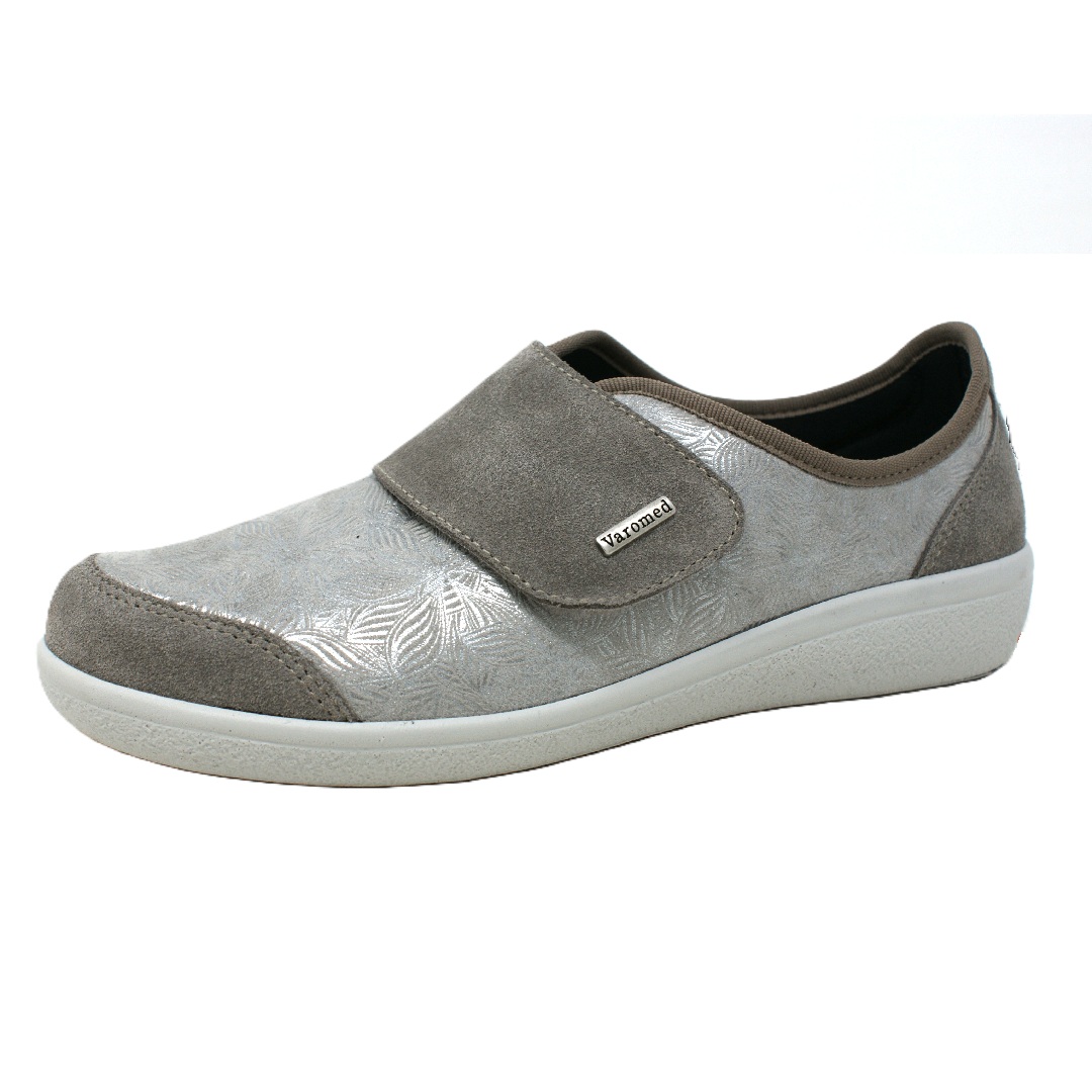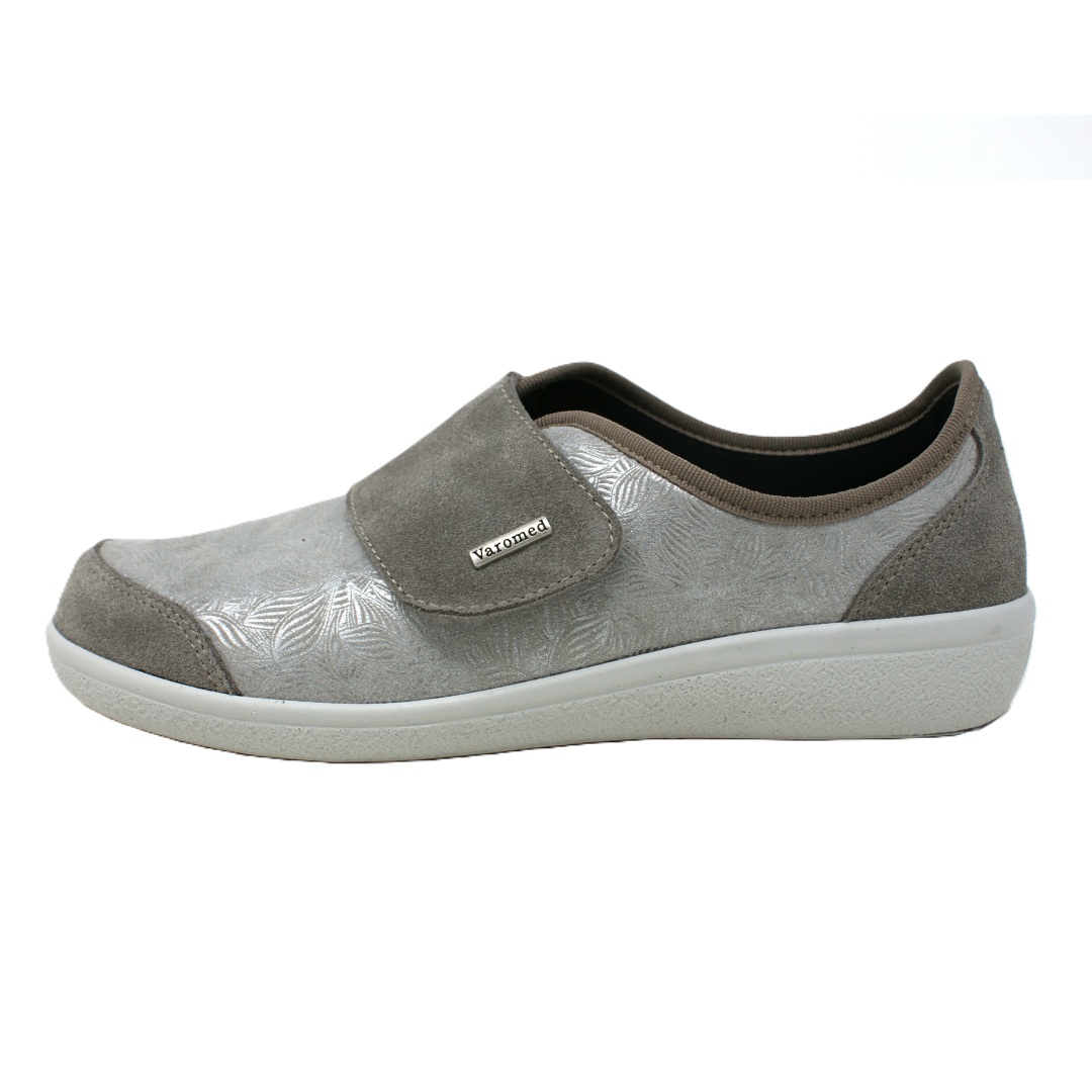 Dámská obuv Varomed 77.743/50 v elegantním světle šedém provedení je navržena s důrazem na maximální komfort a přizpůsobení citlivým chodidlům. Svršek kombinuje jemně strukturovaný materiál s dekorativním vzorem a měkké textilní části, které se dobře přizpůsobují tvaru nohy a minimalizují tlak na problematická místa. Široký pásek na suchý zip umožňuje snadné obouvání i přesné nastavení podle individuálních potřeb, což zajišťuje stabilní a pohodlné usazení chodidla.