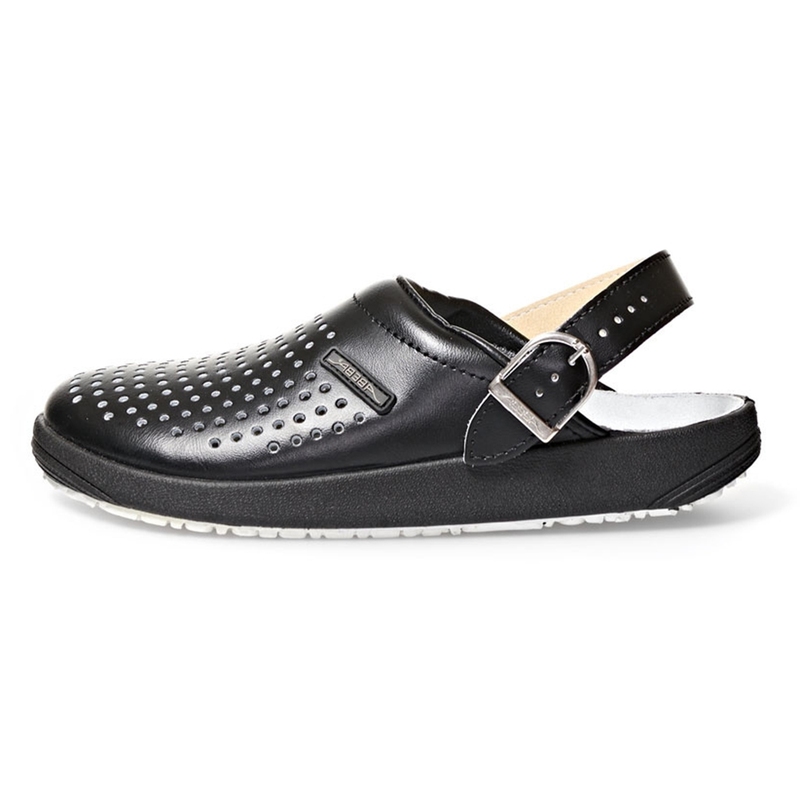 Lékařské pantofle Abeba RUBBER 310 v černé barvě jsou určeny pro profesionální použití ve zdravotnictví a farmaceutickém průmyslu. Obuv splňuje ochrannou kategorii OB a poskytuje základní bezpečnostní prvky, jako je protiskluzová podrážka testovaná na keramických i ocelových površích, antistatické vlastnosti a odolnost podešve vůči naftě. Svršek je vyroben z lícové usně, podšívka z textilu a integrovaná stélka z přírodní kůže zajišťuje pohodlný došlap i při dlouhém nošení.