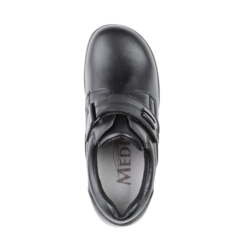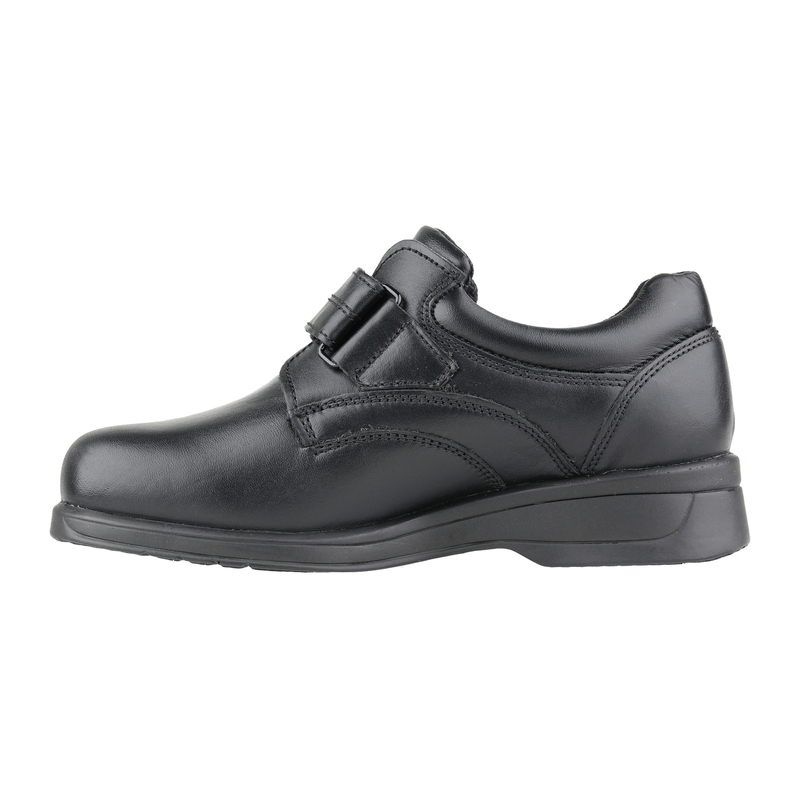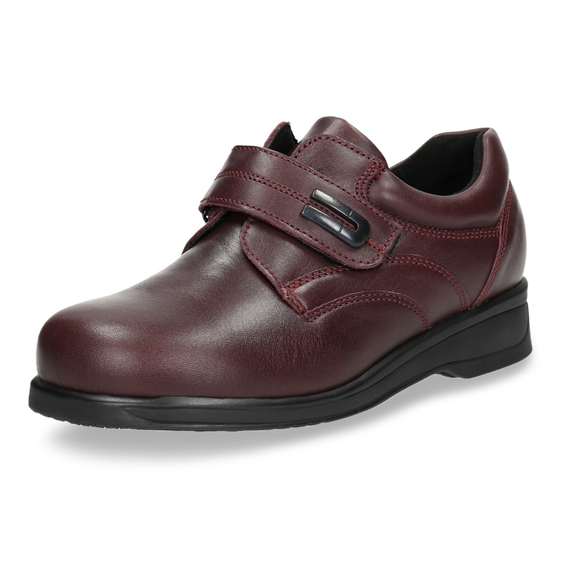 Celoroční diabetická obuv se zapínáním na suchý zip s ozdobnou přezkou, umožňuje pohodlné neškrtivé zapínání boty i při vyšším nártu, odlehčená podešev s vylepšenými protiskluznými vlastnostmi, hladká useň v barvách černá, bordó a nubuková (světle béžová).