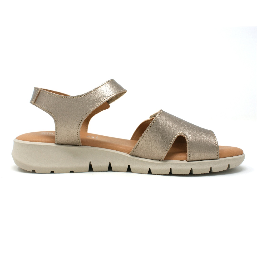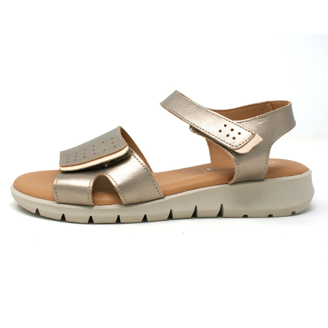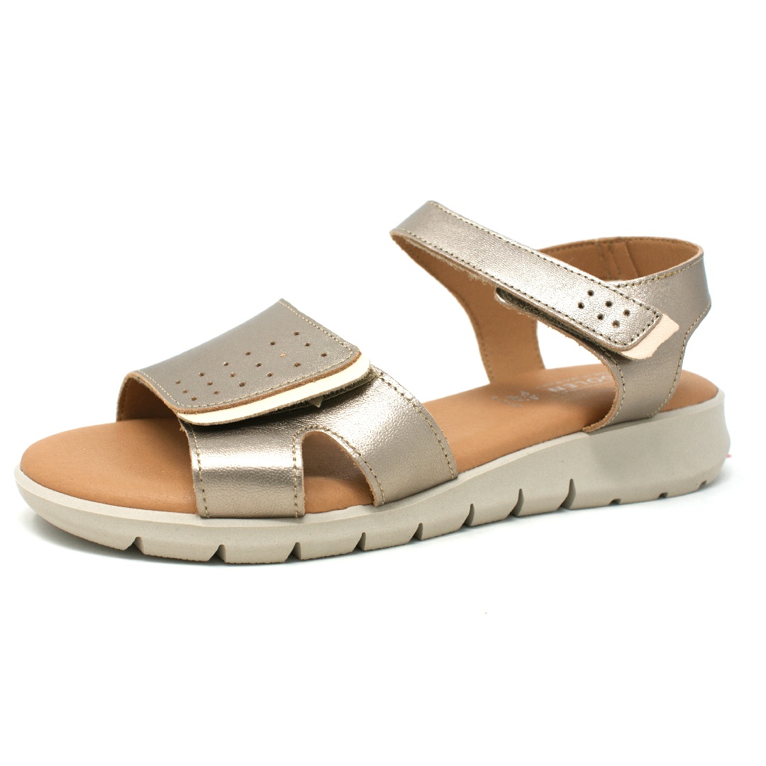 Dámské sandály Madolen Desirae ve zlatém provedení představují elegantní a zároveň velmi pohodlnou obuv pro teplé letní dny. Svršek je vyroben z kvalitní kůže s jemným metalickým efektem, který dodává modelu moderní a elegantní vzhled. Jednoduchý, čistý design s širším předním páskem a zadním páskem přes patu zajišťuje stabilitu a zároveň dostatek prostoru pro chodidlo.
