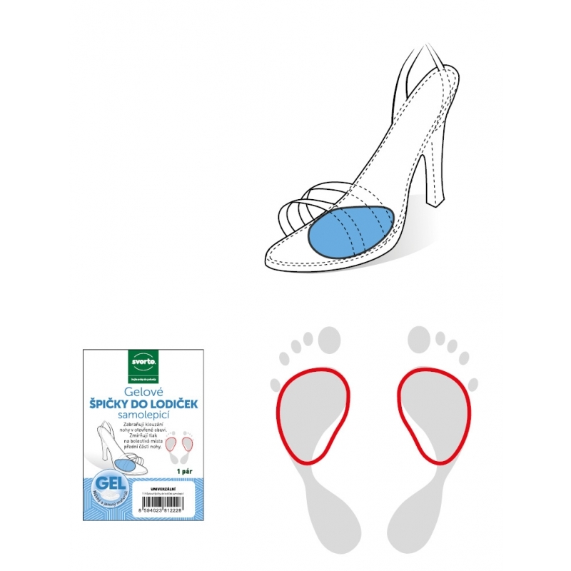 Gelové špičky do lodiček jsou určeny ke zvýšení komfortu při nošení elegantní obuvi, zejména lodiček a bot s užší špičkou. Pomáhají zmírnit tlak na přední část chodidla, tlumí nárazy při došlapu a přispívají k menší únavě prstů při chůzi i delším stání. Jsou vhodné zejména při delším nošení společenské obuvi. Špičky jsou vyrobeny z měkkého gelového materiálu, který se přizpůsobí tvaru chodidla a poskytuje příjemné odpružení. Díky samolepicí vrstvě se snadno aplikují a dobře drží na místě v obuvi. Jsou nenápadné, opakovaně použitelné a představují praktické řešení pro zvýšení pohodlí a ochranu chodidel v lodičkách.