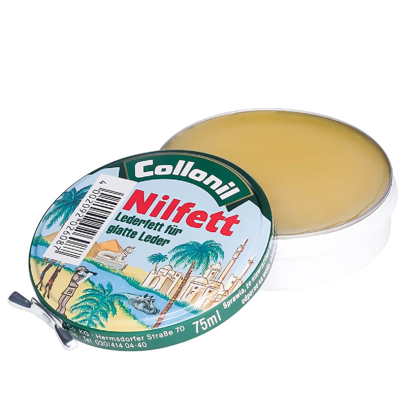 Ošetřující tuk s obsahem přírodních olejů a šťáv tropických stromů pro impregnaci, ošetřování a zvláčňování hladkých usní - použití na obuv, KG, kožené oděvy a také např. na historický usňový nábytek, jezdecká sedla atd.