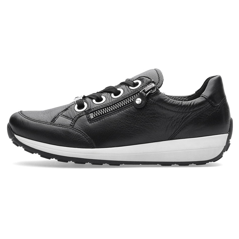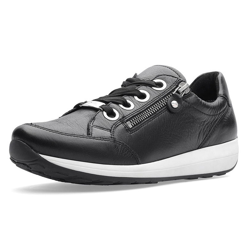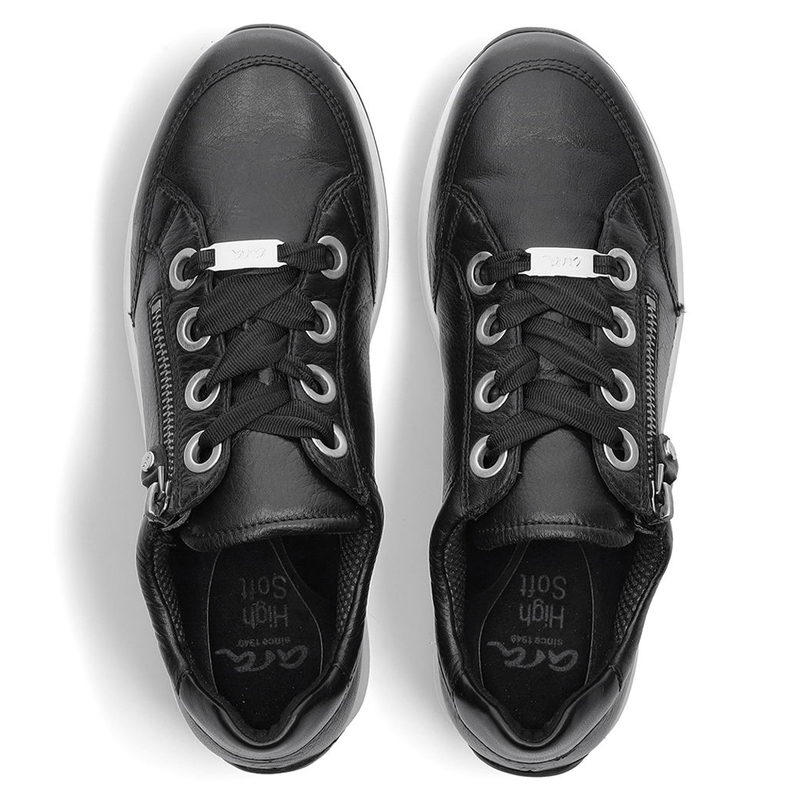 Tyto dámské tenisky značky Ara kombinují styl a pohodlí, které oceníte při každodenním nošení. Vyrobeny z kvalitní usně v černé barvě, nabízejí moderní a elegantní vzhled. Praktický boční zip umožňuje snadné nazouvání, zatímco klasické šněrování s ozdobnými širokými tkaničkami dodává teniskám jedinečný charakter. Lehká a flexibilní podrážka zajišťuje pohodlnou chůzi po celý den, ať už jdete na procházku, do práce nebo trávíte den ve městě. Tyto tenisky jsou skvělou volbou pro ženy, které hledají spojení funkčnosti a módy. Výška podpatku: 3 cm