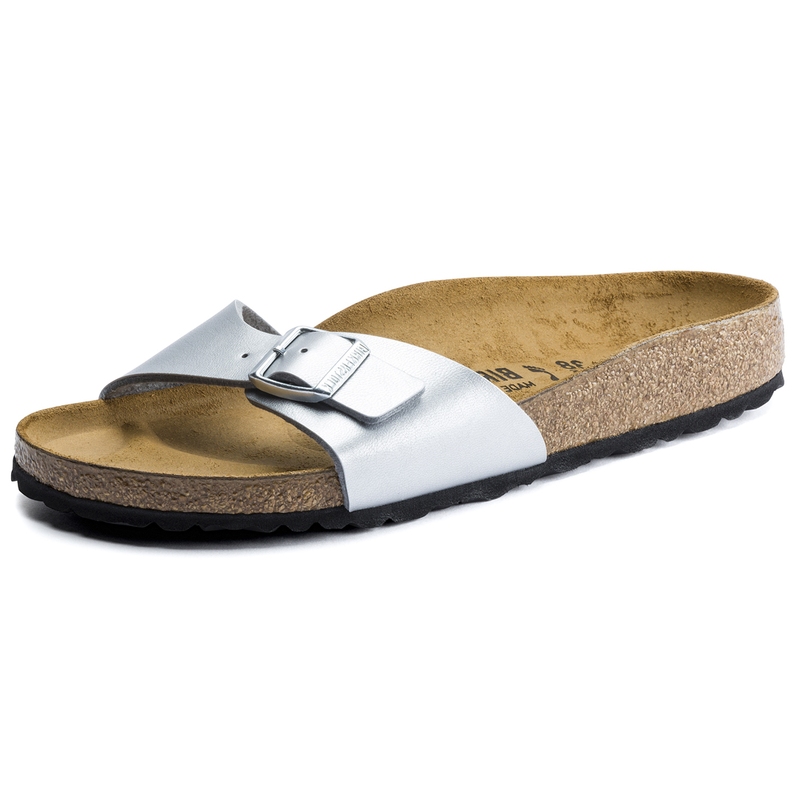 Birkenstock Madrid Birko-Flor Metallic představuje elegantní a moderní verzi klasické jednopáskové sandály. Svršek je vyroben z materiálu Birko-Flor®, který je odolný, snadno se čistí a poskytuje lesklý metalický efekt. Anatomicky tvarovaná stélka z korku a latexu zajišťuje vynikající podporu chodidla, zatímco lehká EVA podešev tlumí nárazy a zvyšuje pohodlí při chůzi. Díky jednoduchému designu a nastavitelnému pásku s kovovou přezkou je tato sandála ideální volbou pro každodenní nošení, které kombinuje styl a komfort.