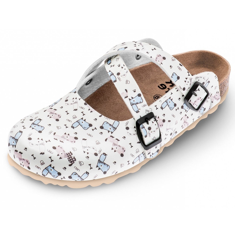 Pantofle mají anatomicky tvarovanou a vyměkčenou stélku z přírodní prodyšné kůže, která podporuje zdravý postoj a tlumí nárazy při chůzi. Plná špice chrání prsty, zatímco rovná podešev nezanechává šmouhy na podlaze a zajišťuje stabilitu. Obuv není určena jako certifikovaná pracovní, ale výborně poslouží doma, v kanceláři nebo lehkém provozu. Roztomilý potisk pejsků potěší každého milovníka zvířat.