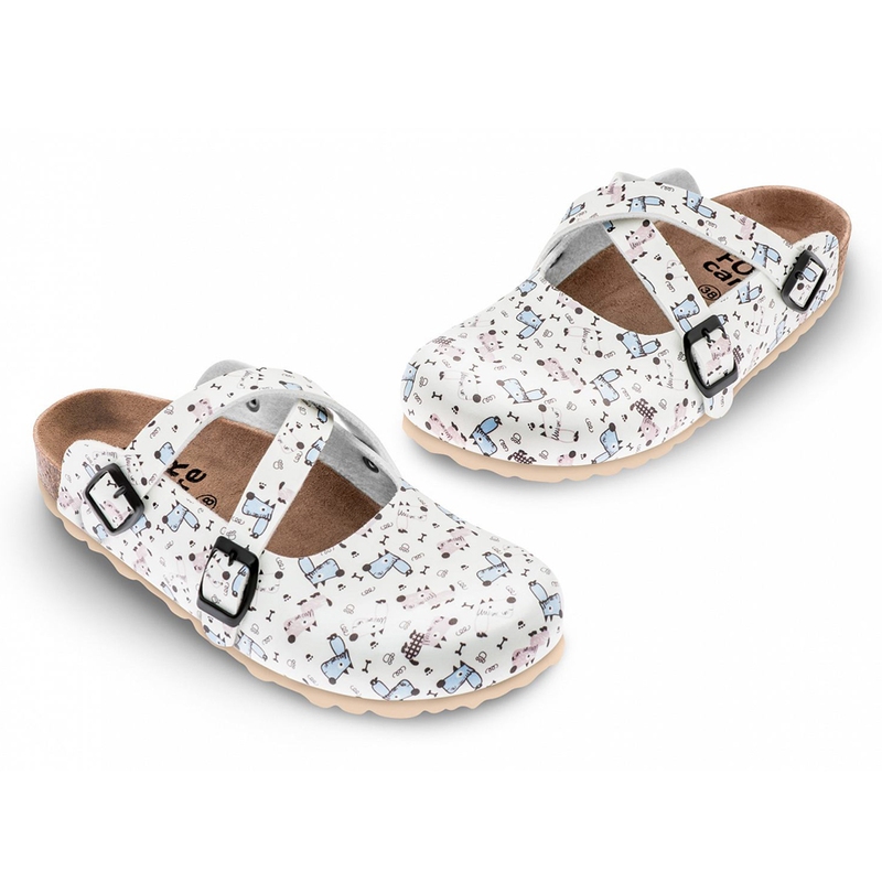 Zdravotní pantofle FORcare 101015 s bílým svrškem a veselým potiskem pejsků jsou ideální volbou pro ty, kdo hledají pohodlnou obuv s hravým designem. Díky dvěma nastavitelným páskům na suchý zip se snadno přizpůsobí různým typům chodidla. Svršek je vyroben ze syntetického materiálu Flor, který je z vnitřní strany podšitý prodyšnou textilií, a poskytuje tak komfort i při celodenním nošení.