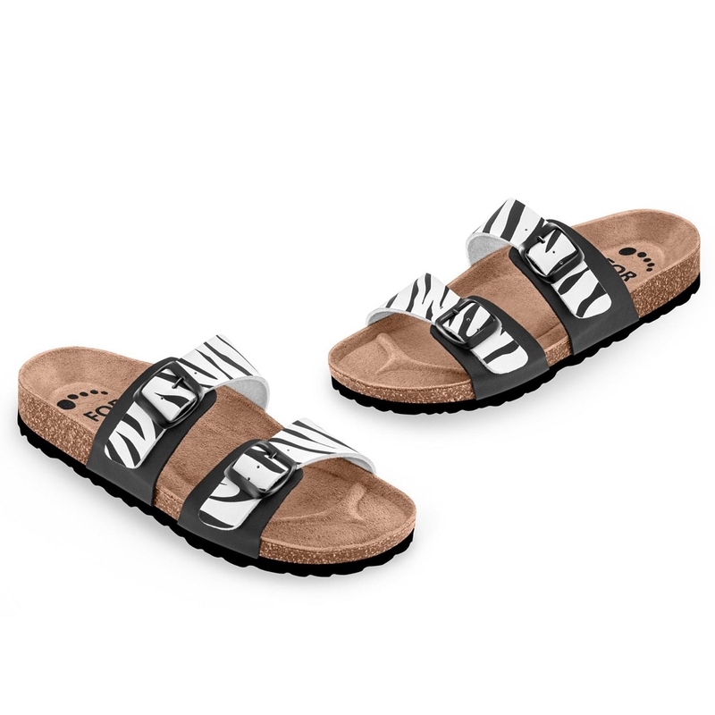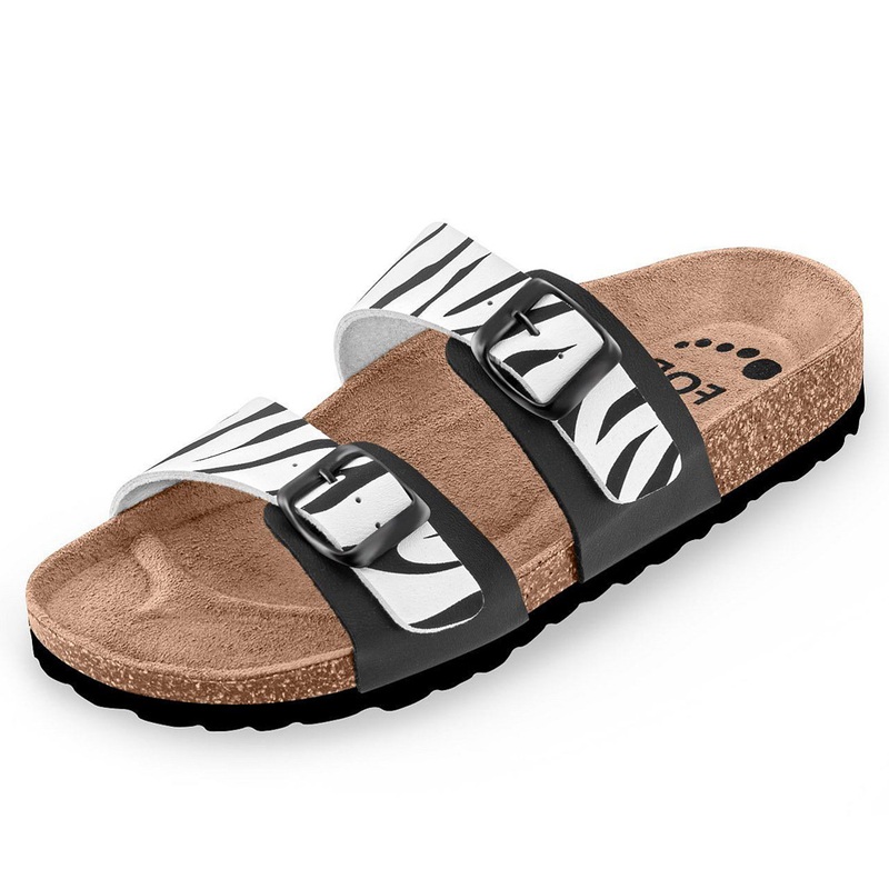 Zdravotní pantofle FORcare 203066 v bílé barvě s výrazným potiskem zebry zaujmou nejen svým designem, ale také skvělým komfortem. Svršek je vyroben ze syntetického materiálu Flor, který je z vnitřní strany podšitý prodyšnou textilií, takže nohy zůstávají v suchu a pohodlí i při celodenním nošení. Dva nastavitelné pásky na suchý zip umožňují snadné přizpůsobení obuvi podle šířky chodidla.