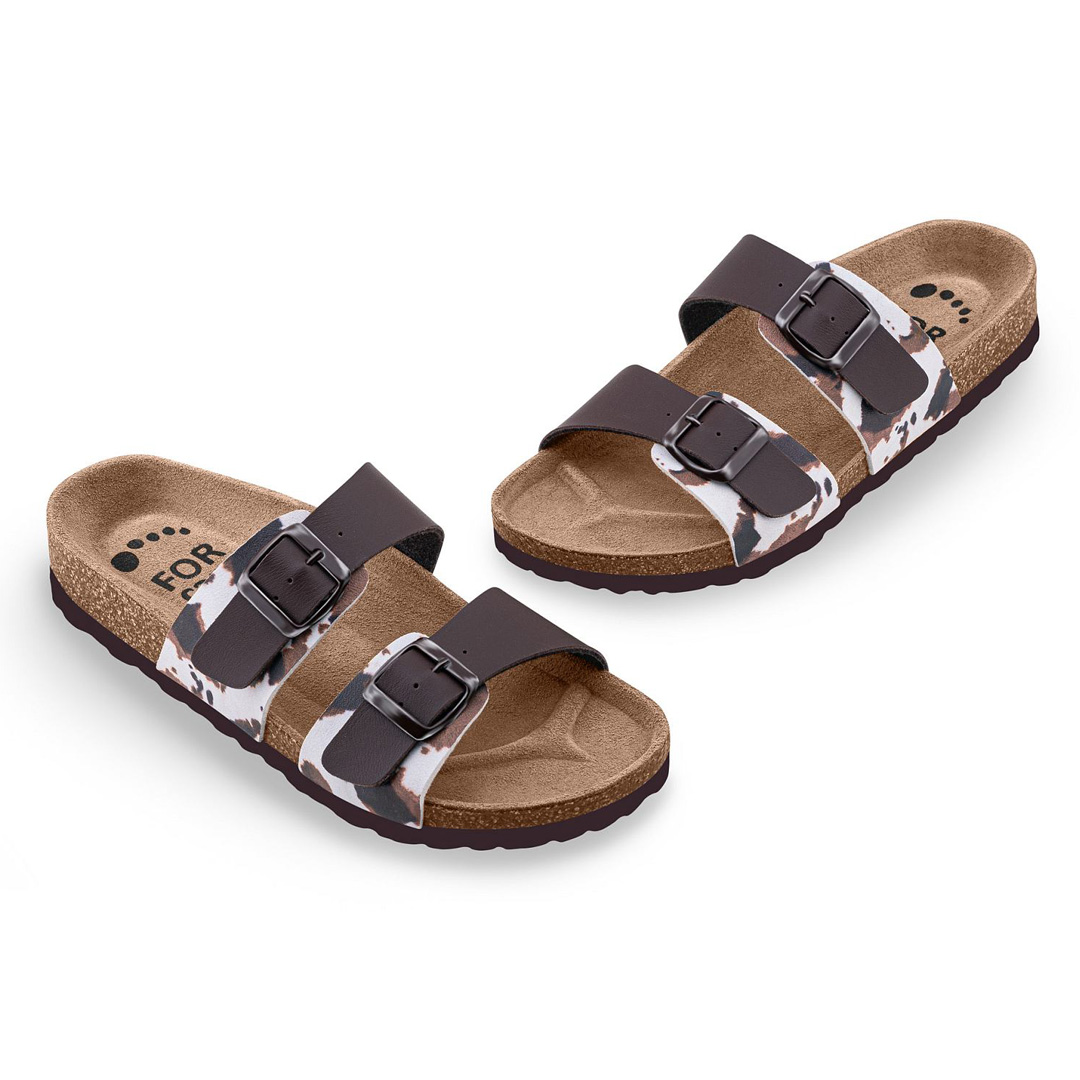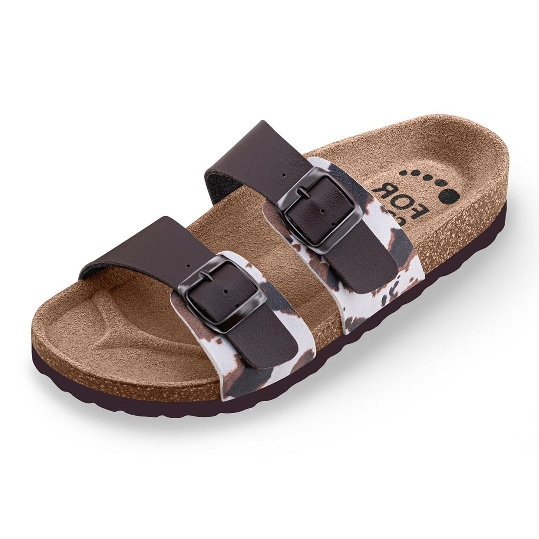 Zdravotní pantofle FORcare 203067 v hnědém provedení s hravým potiskem krav jsou skvělou volbou pro ty, kteří hledají pohodlnou, odlehčenou obuv s veselým designem. Svršek tvoří odolný syntetický materiál Flor, který je z vnitřní strany podšitý prodyšnou textilií. Dva nastavitelné pásky na suchý zip umožňují snadné přizpůsobení obuvi různým typům chodidel. Pantofle jsou vybaveny anatomicky tvarovanou a vyměkčenou stélkou z přírodní kůže, která výborně absorbuje vlhkost a podporuje zdravé držení těla. Rovná podešev je neklouzavá, nezanechává šmouhy a je vhodná pro všechny typy suchých podlah. Obuv není určena do vlhkého prostředí, ale skvěle poslouží jako domácí nebo lehká pracovní zdravotní obuv. Design s motivem krav dodává modelu hravost a originalitu, která potěší každého milovníka zvířat.