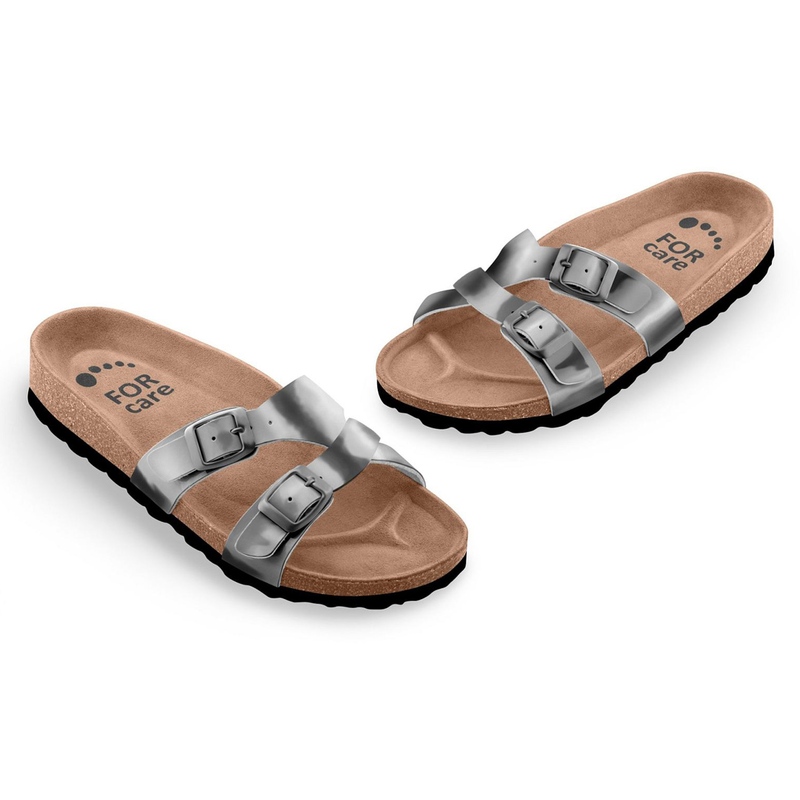 Zdravotní pantofle FORcare 212162 v elegantním antracitovém lesklém provedení kombinují stylový vzhled s maximálním pohodlím. Svršek je vyroben z kvalitní eko kůže – syntetického materiálu složeného ze dvou vrstev, z nichž vrchní je odolný polyuretan a spodní tvoří příjemná tkanina. Pantofle jsou vhodné jako domácí i pracovní obuv (bez ochranné certifikace), ideální do suchého prostředí.