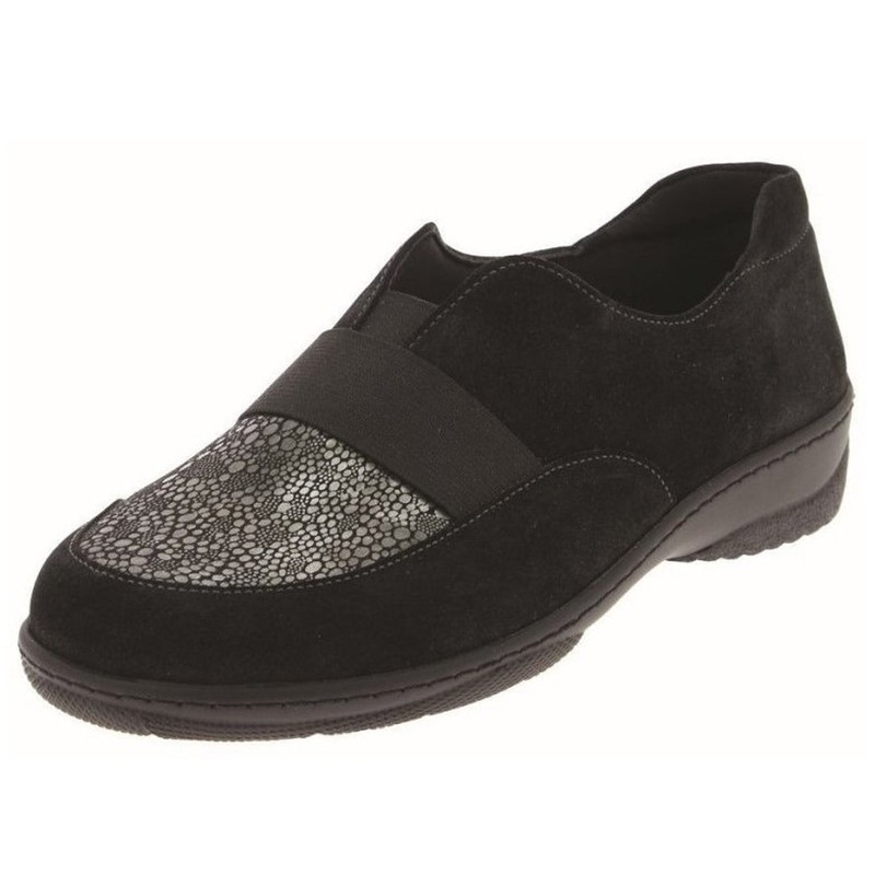 Obuv Podowell Marion v černém provedení nabízí elegantní vzhled v kombinaci s maximálním pohodlím a funkčností. Svršek z pružného a měkkého materiálu se výborně přizpůsobí tvaru chodidla, což ocení především osoby s hallux valgus, kladívkovými prsty nebo otoky. Zapínání na suchý zip umožňuje rychlé obouvání a úpravu šířky boty. Vnitřní část je bezešvá, měkce vypolstrovaná a ideální i pro velmi citlivá chodidla. Vyjímatelná stélka je vhodná pro použití ortopedických vložek. Protiskluzová a odlehčená podešev zajišťuje jistotu při chůzi. Obuv je vhodná pro každodenní nošení doma i venku.