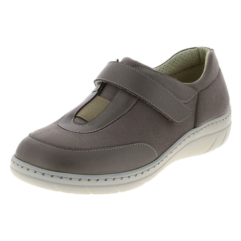 Obuv Podowell Valerie v bronzovém provedení je elegantní a zároveň mimořádně pohodlná obuv určená pro osoby s citlivými, oteklými nebo deformovanými chodidly. Díky měkkému a elastickému svršku se bota snadno přizpůsobí tvaru nohy, aniž by vytvářela tlak na citlivá místa. Dva pásky na suchý zip přes nárt umožňují široké otevření, snadné obouvání a přesné nastavení šířky podle individuálních potřeb. Bezešvá a měkce polstrovaná vnitřní podšívka poskytuje maximální komfort i při dlouhodobém nošení, což ocení zejména diabetici nebo osoby po operacích. Vyjímatelná stélka je vhodná pro použití vlastních ortopedických vložek. Lehká, protiskluzová podešev zajišťuje stabilitu a bezpečnost při chůzi. Obuv je vhodná jak pro vnitřní, tak venkovní použití.