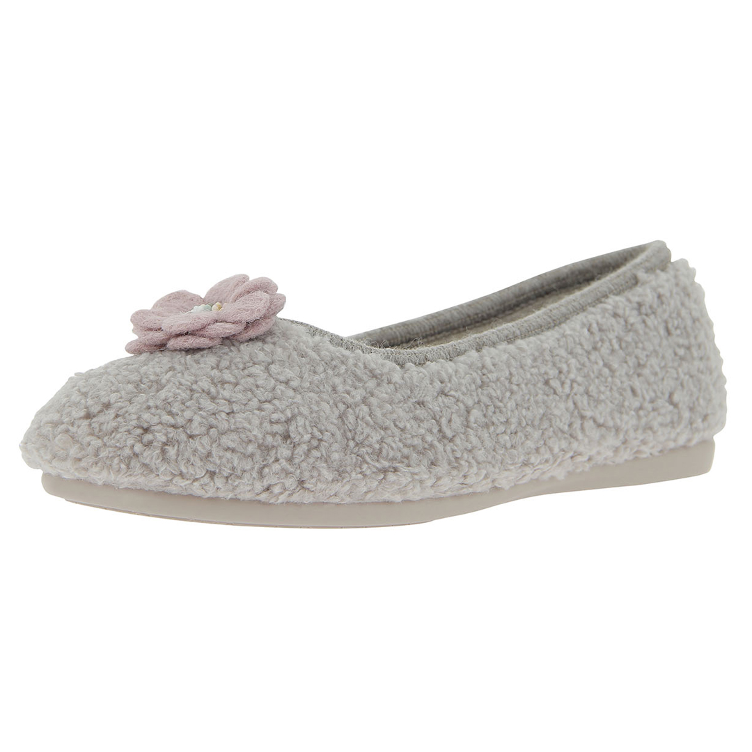 Tato dámská domácí obuv značky Varomed spojuje jemný design s maximálním pohodlím. Svršek je tvořen měkkým, strukturovaným materiálem s efektem vlněného beránka, který je na dotek příjemný a hřejivý. Model ve světlém odstínu šedé barvy působí čistě a elegantně, zatímco ozdobná květina v růžovém tónu dodává obuvi něžný a ženský vzhled. Díky nízkému profilu a pružné konstrukci je nazouvání snadné a chůze naprosto pohodlná.