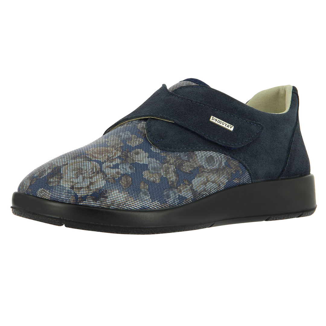Tato dámská zdravotní obuv značky Varomed zaujme svým elegantním květinovým vzorem v kombinaci s tmavě modrým semišem, který dodává botě stylový a vkusný vzhled. Model je navržen s ohledem na pohodlí, funkčnost a snadné obouvání – díky suchému zipu je možné obuv rychle nazout i přizpůsobit tvaru nohy. Měkký, prodyšný materiál svršku je ideální pro osoby s citlivými chodidly, otoky nebo jinými ortopedickými potížemi. Pohodlí při chůzi zajišťuje měkce polstrovaný vnitřek a lehká, ergonomicky tvarovaná podešev, která tlumí nárazy a zaručuje stabilitu. Tento model je vhodný nejen pro domácí použití, ale i jako každodenní pohodlná obuv na pochůzky, do práce nebo při delších procházkách. Díky decentnímu, ale originálnímu designu spojuje Varomed v této obuvi zdravotní benefity s estetikou a moderním vzhledem, čímž uspokojí i náročnější uživatelky.