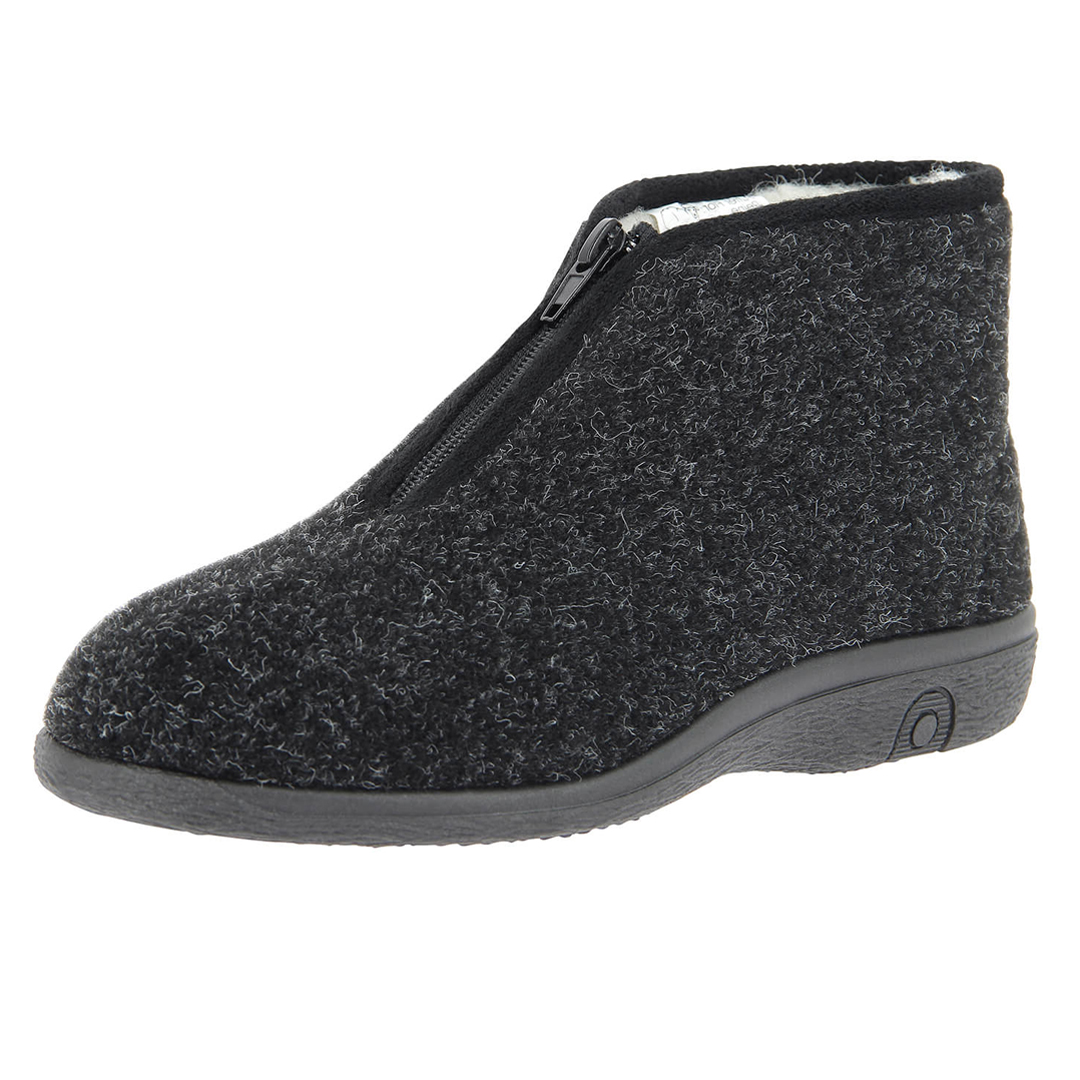 Tato kotníková domácí obuv značky Varomed je navržena pro maximální tepelný komfort a pohodlí během zimních měsíců. Svršek je z hřejivého, vlněného materiálu s huňatou strukturou, který nejen dobře izoluje, ale i působí příjemně měkce na dotek. Praktický zip umístěný na nártu umožňuje snadné obouvání a vyzouvání bez námahy, což ocení zejména senioři nebo osoby s omezenou hybností. Vnitřek je zateplený měkkou podšívkou, která udržuje nohy v teple i při nízkých teplotách. Podešev je lehká, protiskluzová a mírně pružná, takže zajišťuje bezpečný a pohodlný krok na různých typech podlah. Tento model je ideální pro domácí prostředí, ale skvěle poslouží i v pečovatelských zařízeních. Jednoduchý černý design s decentní strukturou se snadno kombinuje s jakýmkoli domácím oblečením, a přitom zůstává stylový i praktický.