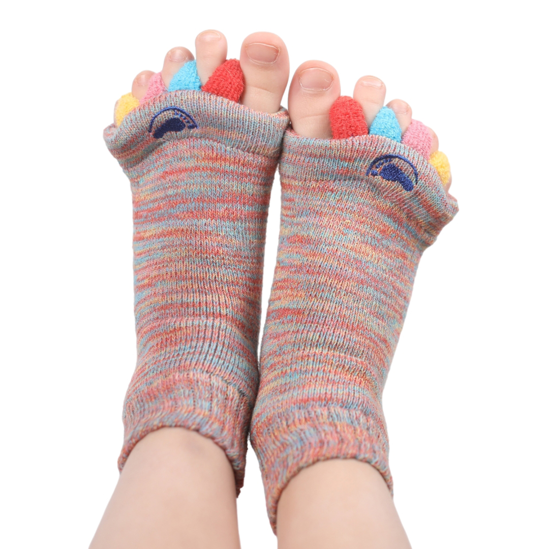 Dětské Adjustační ponožky® KIDS slouží jako terapeutická pomůcka pro uvolnění spasticity nohy při DMO, pro stísněné a křivé prsty a jiné deformity nohou. Používají se především jako doplněk aktivního cvičení a fyzioterapie. Díky speciálním meziprstním oddělovačům se zrychluje krevní oběh a tím se urychluje i regenerace nohou. Adjustační ponožky pomáhají tím, že udržují nohy a prsty mobilní, ohebné, a tím méně bolestivé. Dětské Adjustační ponožky jsou vyrobeny z jemné bavlny s příměsí polyesteru a elastanu. Mají volnější lem a otevřenou přední část se čtyřmi oddělovači prstů vyrobenými ze stejného materiálu jako celé ponožky. Tyto oddělovače vyvíjejí jemný tlak na prsty u nohou, aby vyrovnaly prsty s chodidlem. Oddělovače jsou vyráběné ručně a a jejich výroba je přísně kontrolována, protože pro dosažení maximálního efektu ponožek je velmi důležité dodržení jejich správné délky a šířky. Adjustační ponožky uvolňují stres a napětí v nohách, pomáhají správně sladit prsty, snižují tření a podráždění, zmírňují bolesti nohou, zlepšují krevní oběh, dodávají nohám a prstům novou energii. S nošením ponožek u dětí začínejte velmi pomalu, vždy pod dohledem dospělého.
